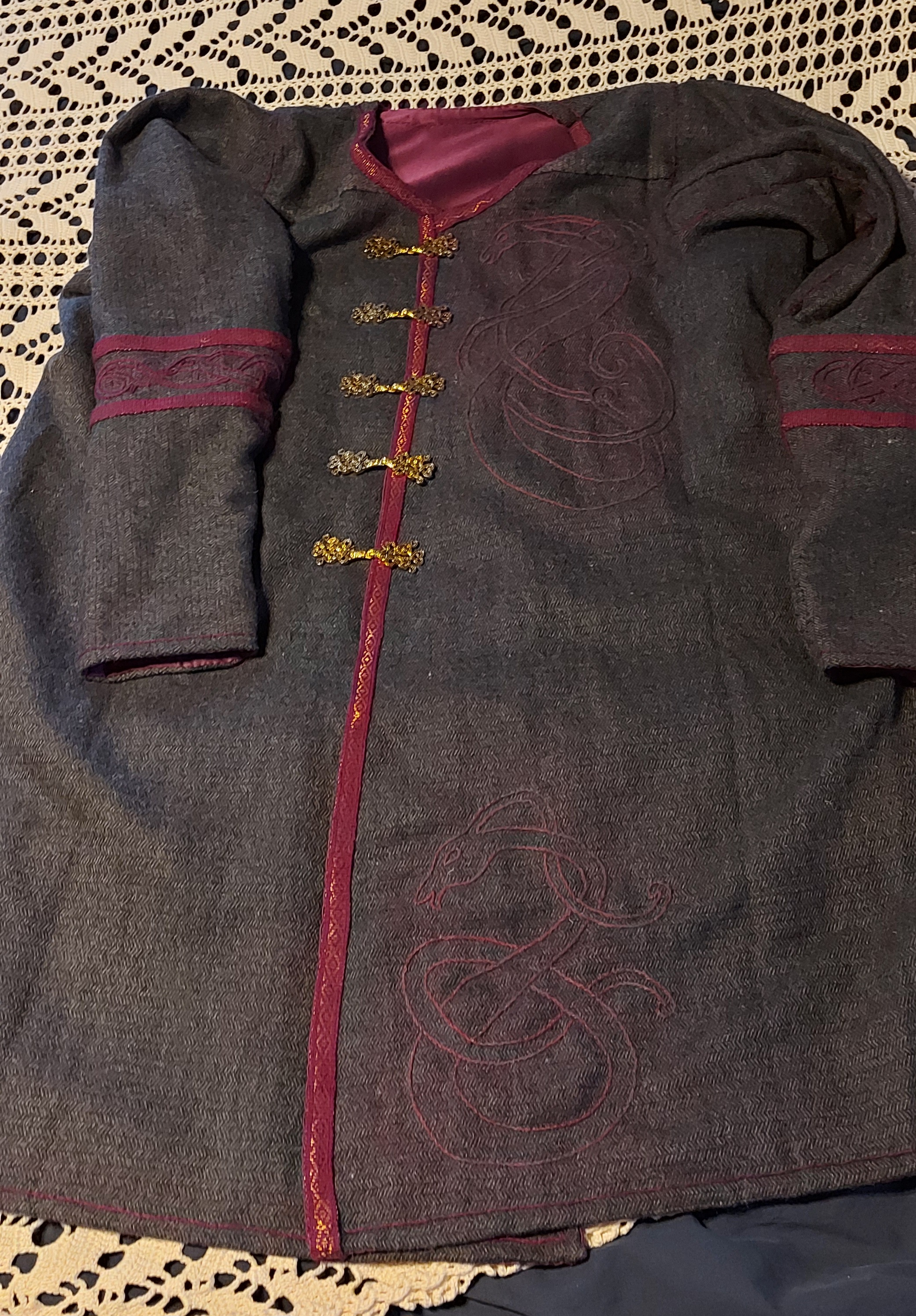 2025-12-24 julafton finished embroidery of the dragons on the sleeves, and lined the right sleeve