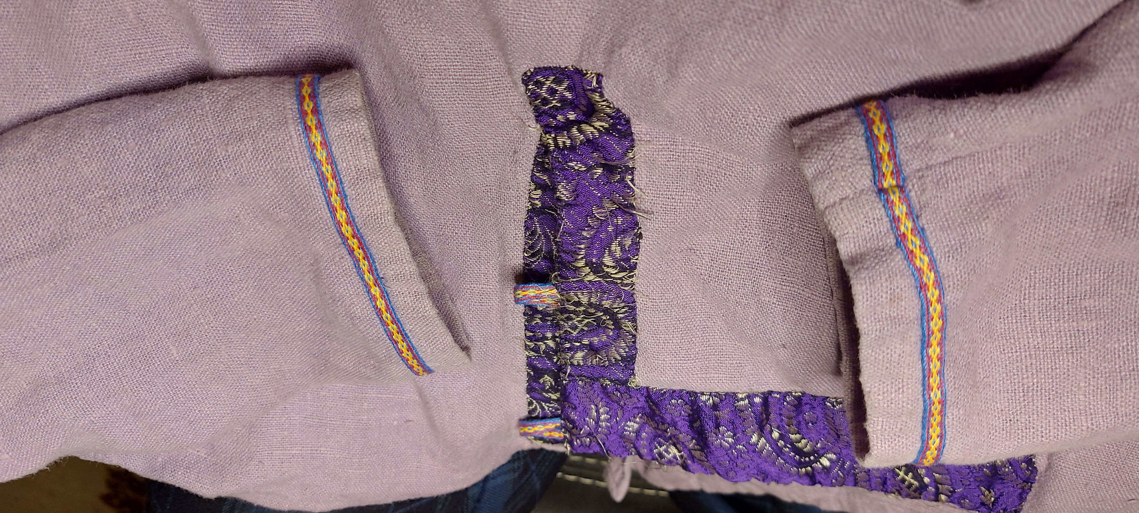 On 2025-12-15 trim on his tunic I attached the purple/light maroon red/yellow narrow tablet woven trim Keldor got from Umas Dansmasterine in trade for the knife Skote to the purple Linen tunic that Geri made him.
