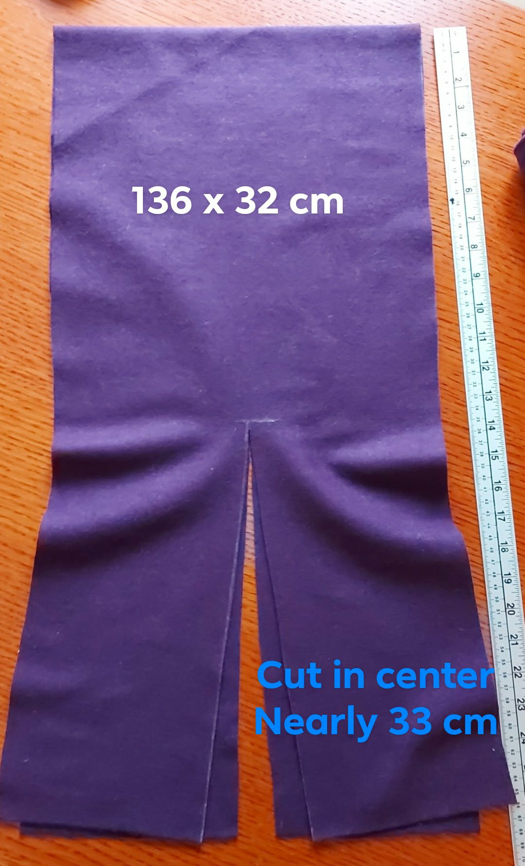 This sort of hood is a simple rectangle/triangle construction, where the rectangle is wide enough to cover the head from front to back, and long enough to drape over the head and shoulders as far down the body as wished. In this case we used the full width of the fabric for the length of the rectangle, or 136 cm, and made the width 32 cm.