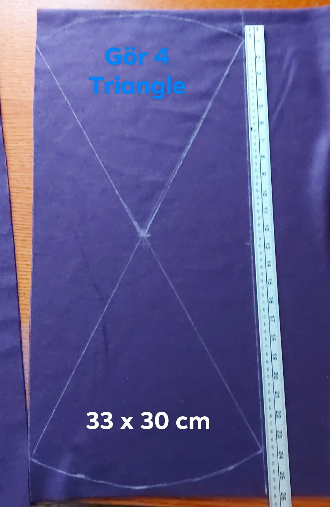 This style of hood has four gores, one each centred on front and back, and one each centred on each shoulder. I often do these by starting with a square, cutting it into three triangles, one full width, and two others half width, which I then sew together to make a a wider triangle. However, Charlotte is new to sewing, so to make this one easier we just made the triangles 33 cm tall and 30 cm wide,