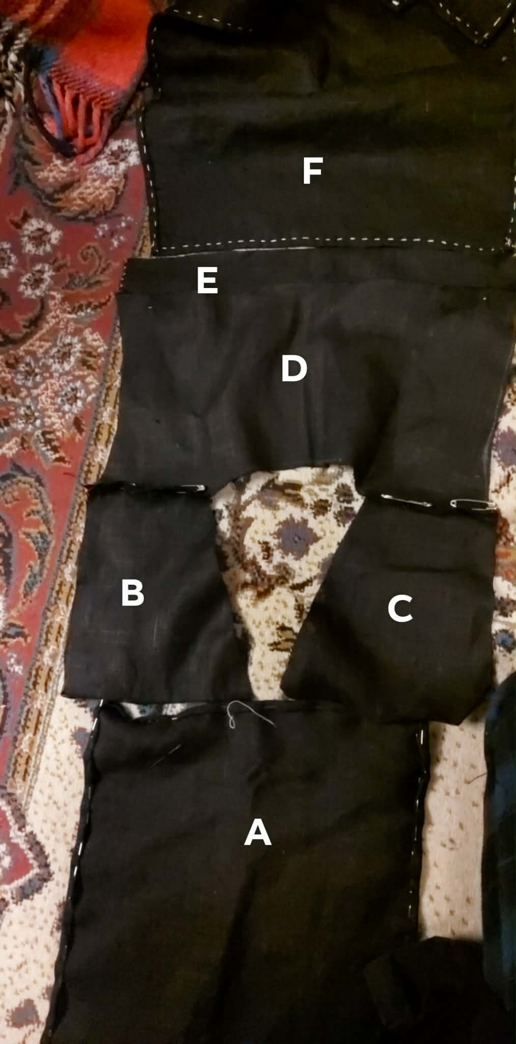 on 2026-01-30 visitors! I helped Cinder cut out a tabard from some of my black scrap linen. Since none of the pieces were especially big, it involved a number of pieces. Since Cinder also got help from Keldor this visit with some armour, there wasn’t time to complete the job before heading home again, so I wrote up the below and sent it to her, so she’d be able to finish it on her own.