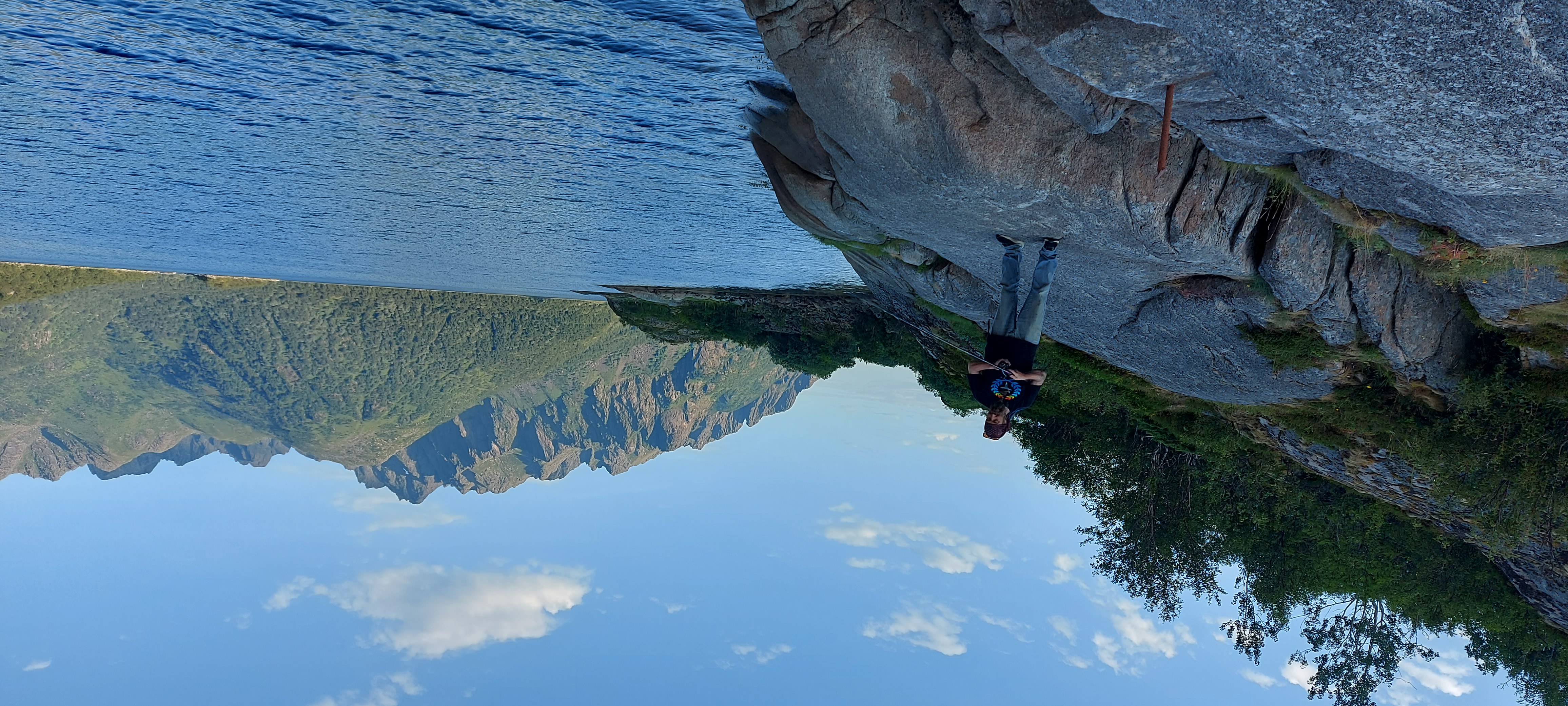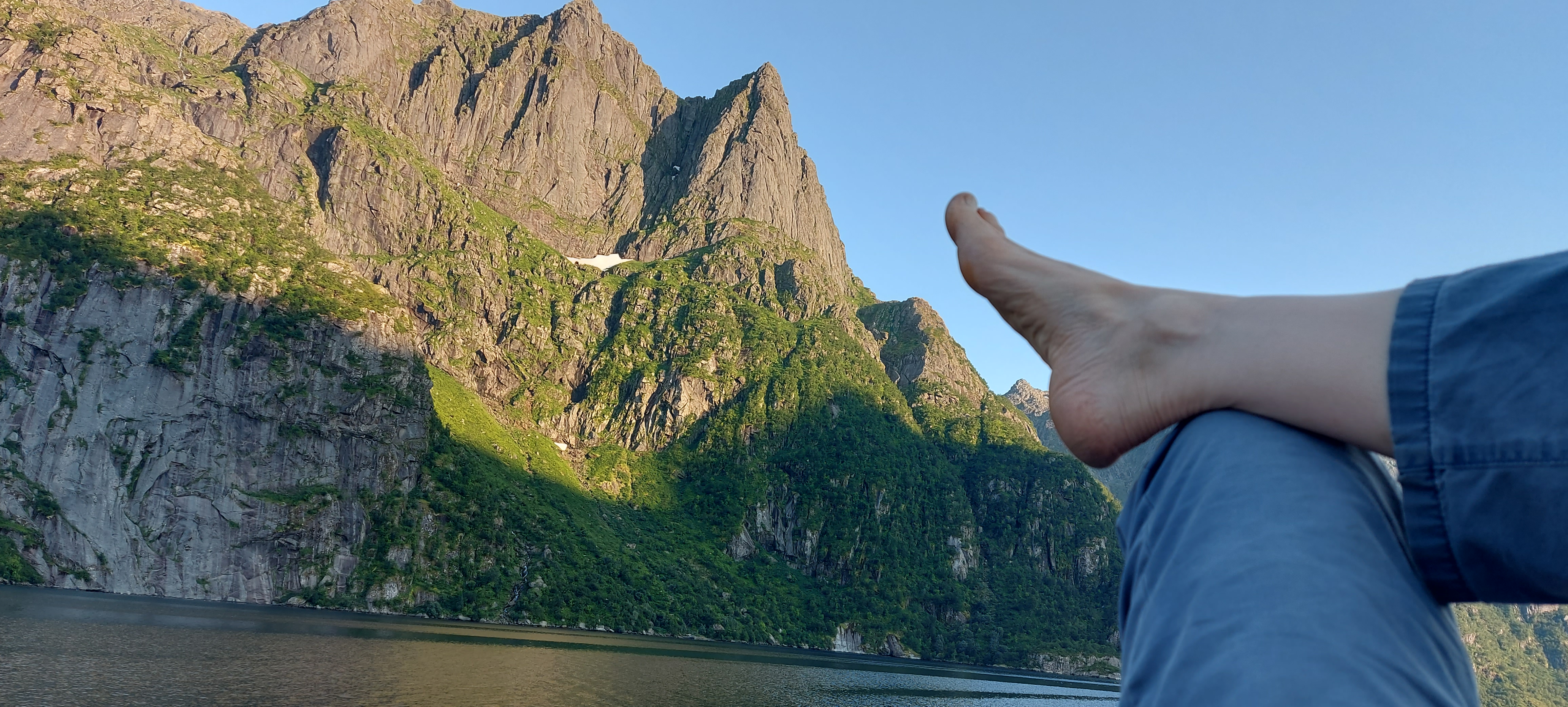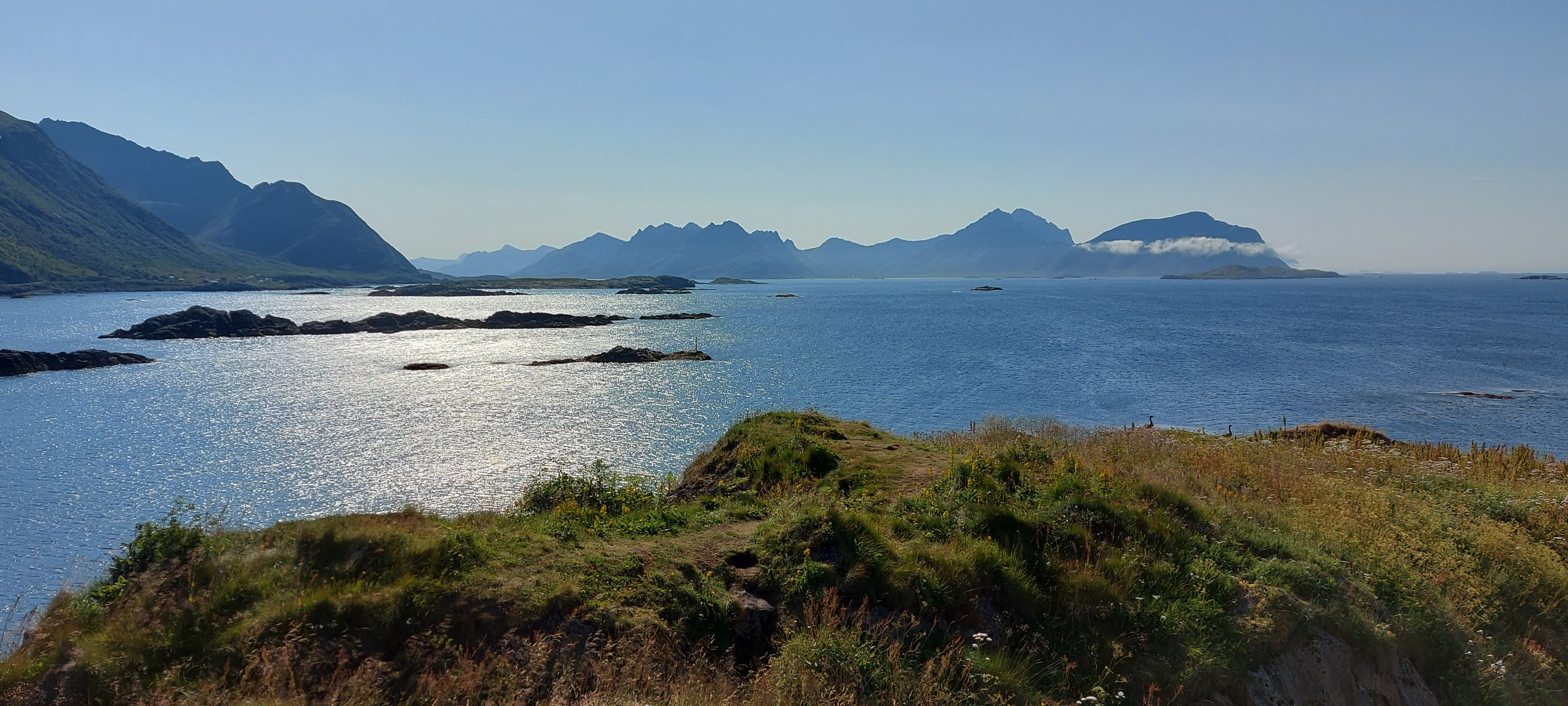 We paused just over half way at a place we had spotted (and marked on the map) on the way north so that he could do some fishing, and I could do a bit of yoga. Then I just leaned back on the mattress I had carried down to the rocks to make yoga more comfortable, and enjoyed the view whilst typing up this, though posting had to wait till we got back to the house and onto the computer, so I could look up a URL for photos to include.