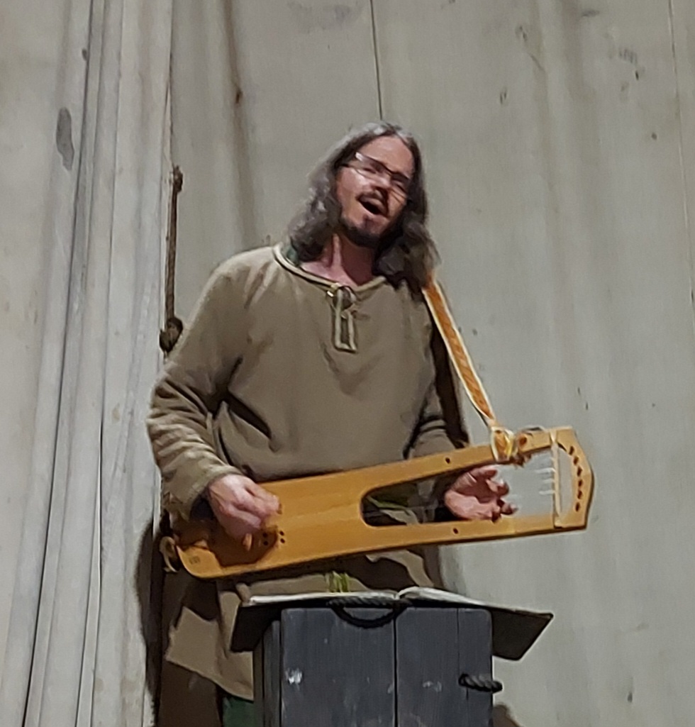 On one of my walks over towatds the toilet I saw a guy in a leather tunic and hood, and paused to compliment him on it. This lead to a conversation in which it was mentioned that he was performing with his Viking Age instruments in the boathouse that afternoon, so I set my alarm and went down there when it went off. It was a delightful show. He sang and played three different types of lyres, each patterened after a specific find, and a horn flute, and a bone flute.
