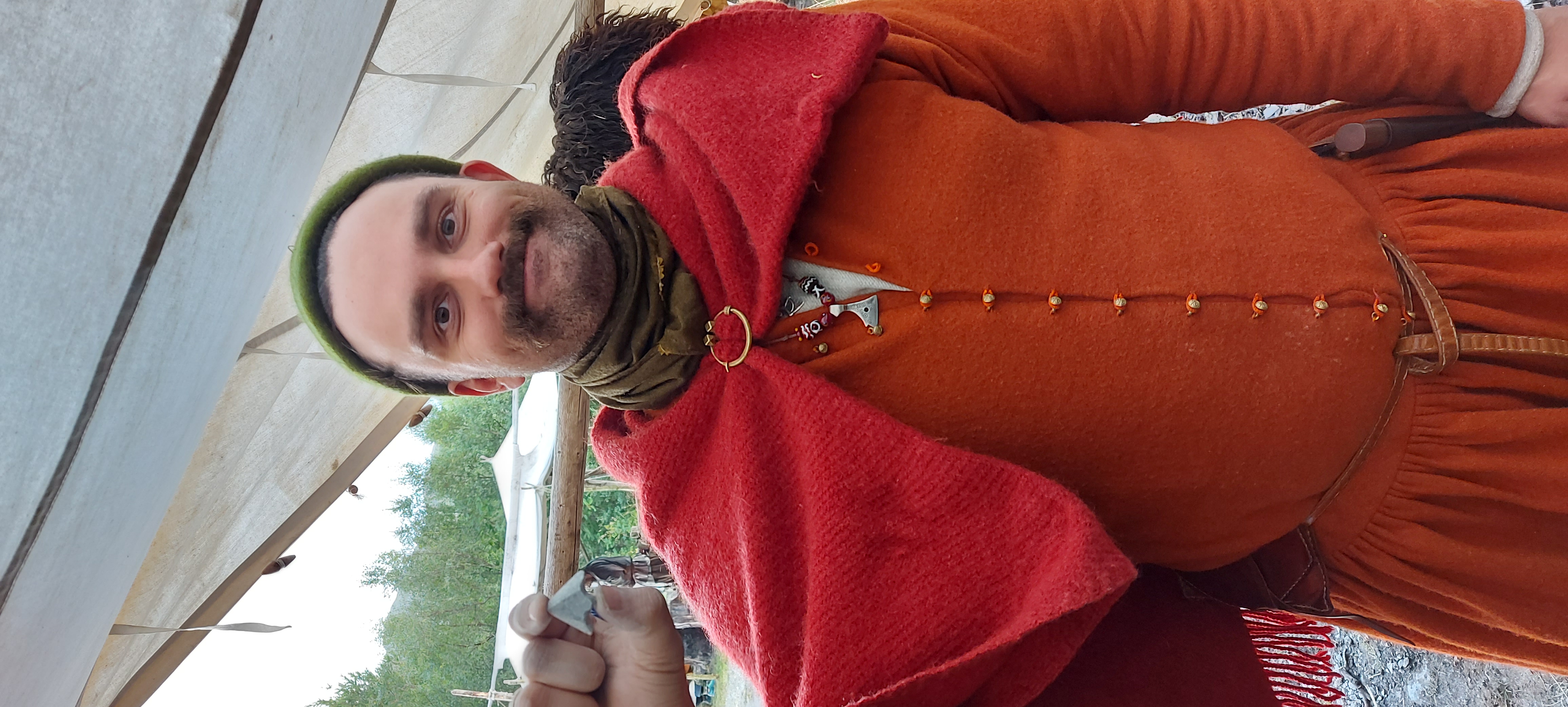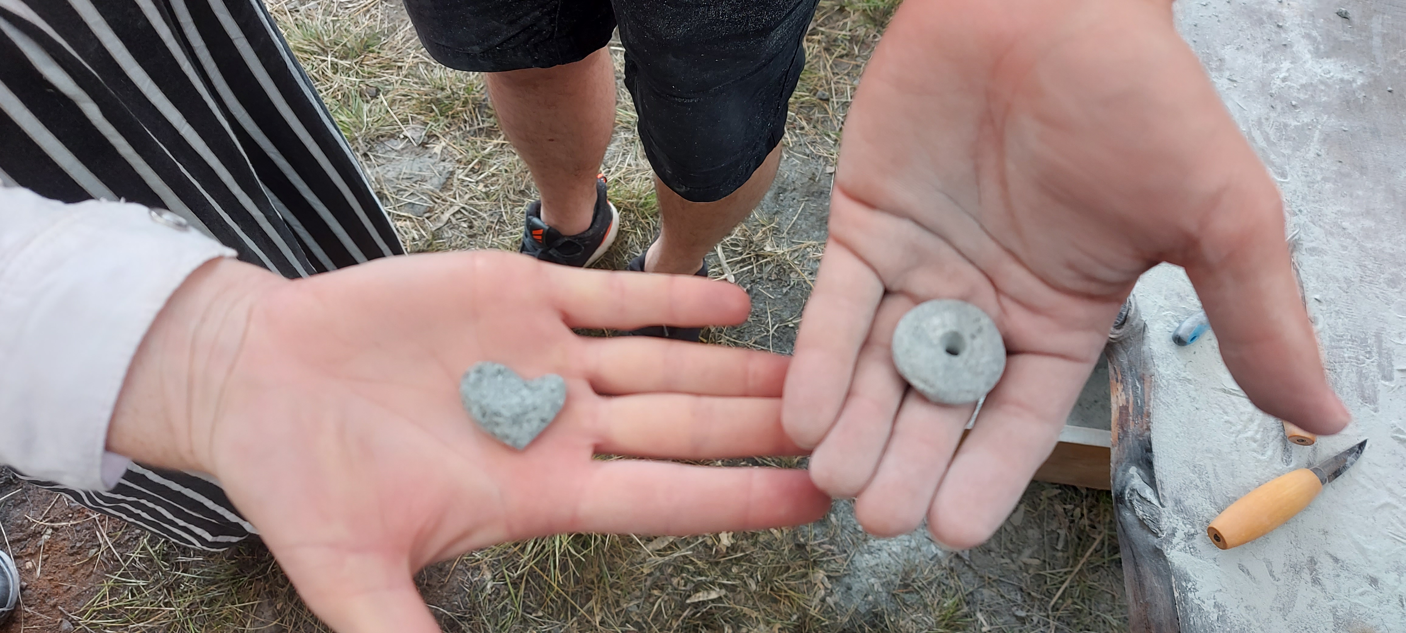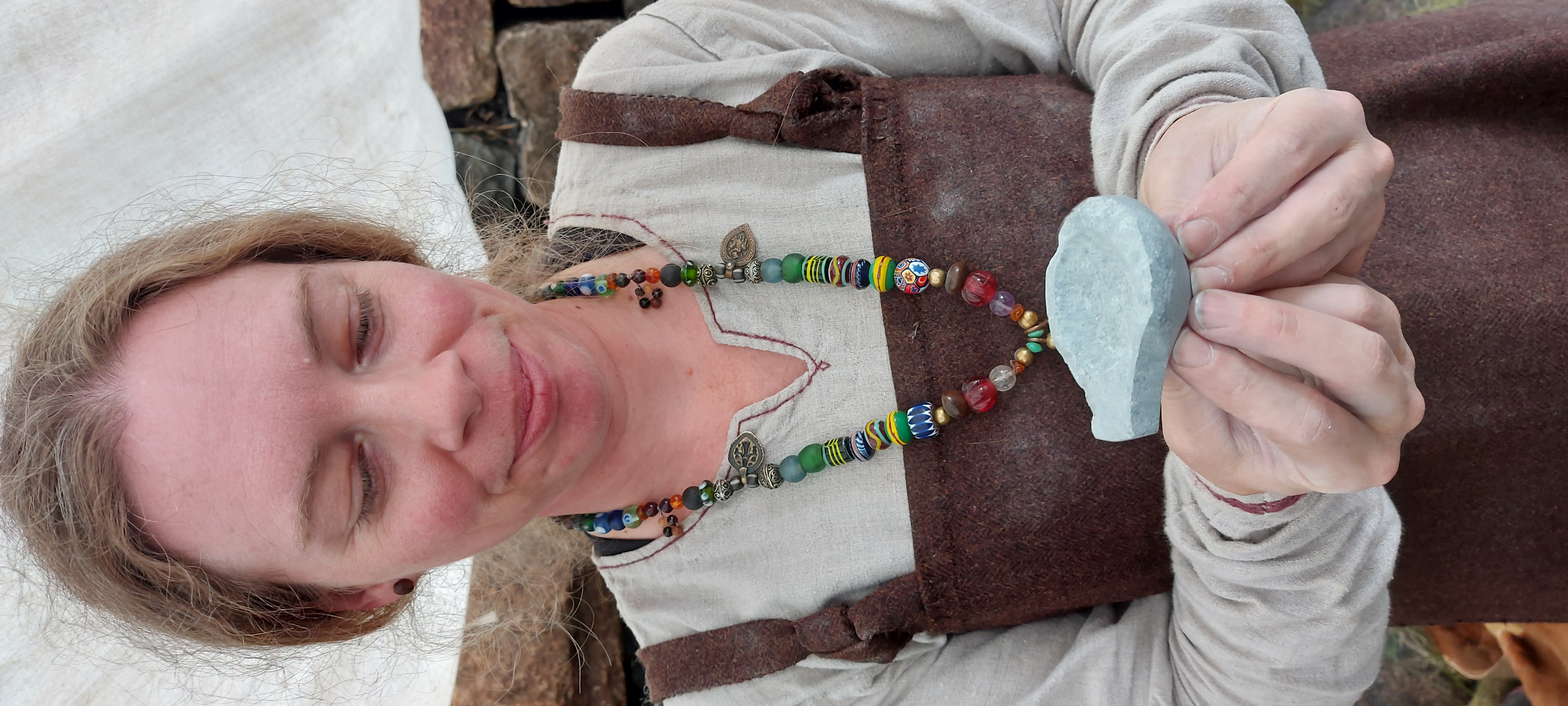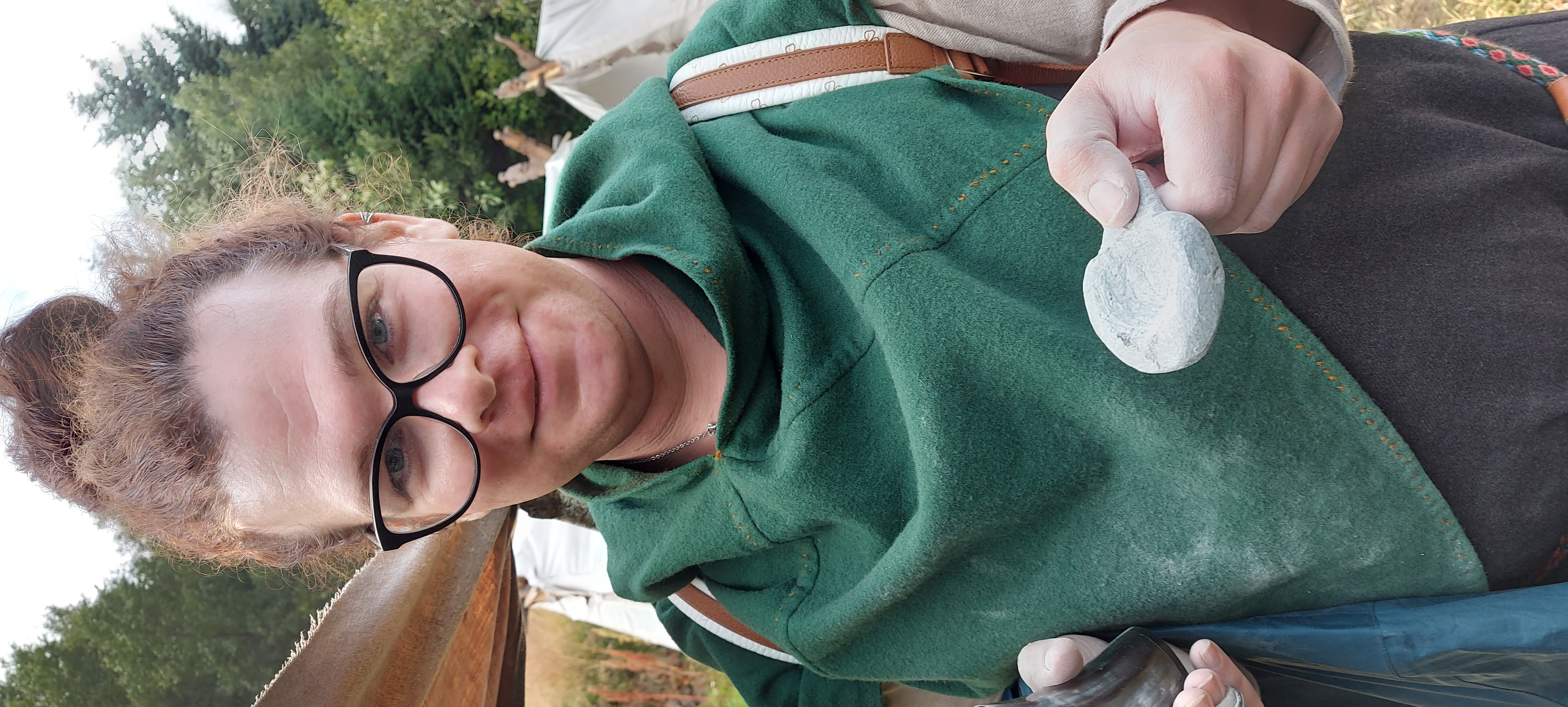I took photos of most (but absoutly not everyone) of the people and their finished projects, and just counted. 21 people! Most of whom did small things like spindle whorls or necklaces, but there were a couple of oil lamps. Eight of these were festival participants in Viking clothing, six were children in modern cloths, and seven were adults in modern clothes. At least one more adult finished a piece,showed it to me and left before I thiught about asking if I could take photos, and I am pretty certain a handful of other children participated without showing me a finished product.