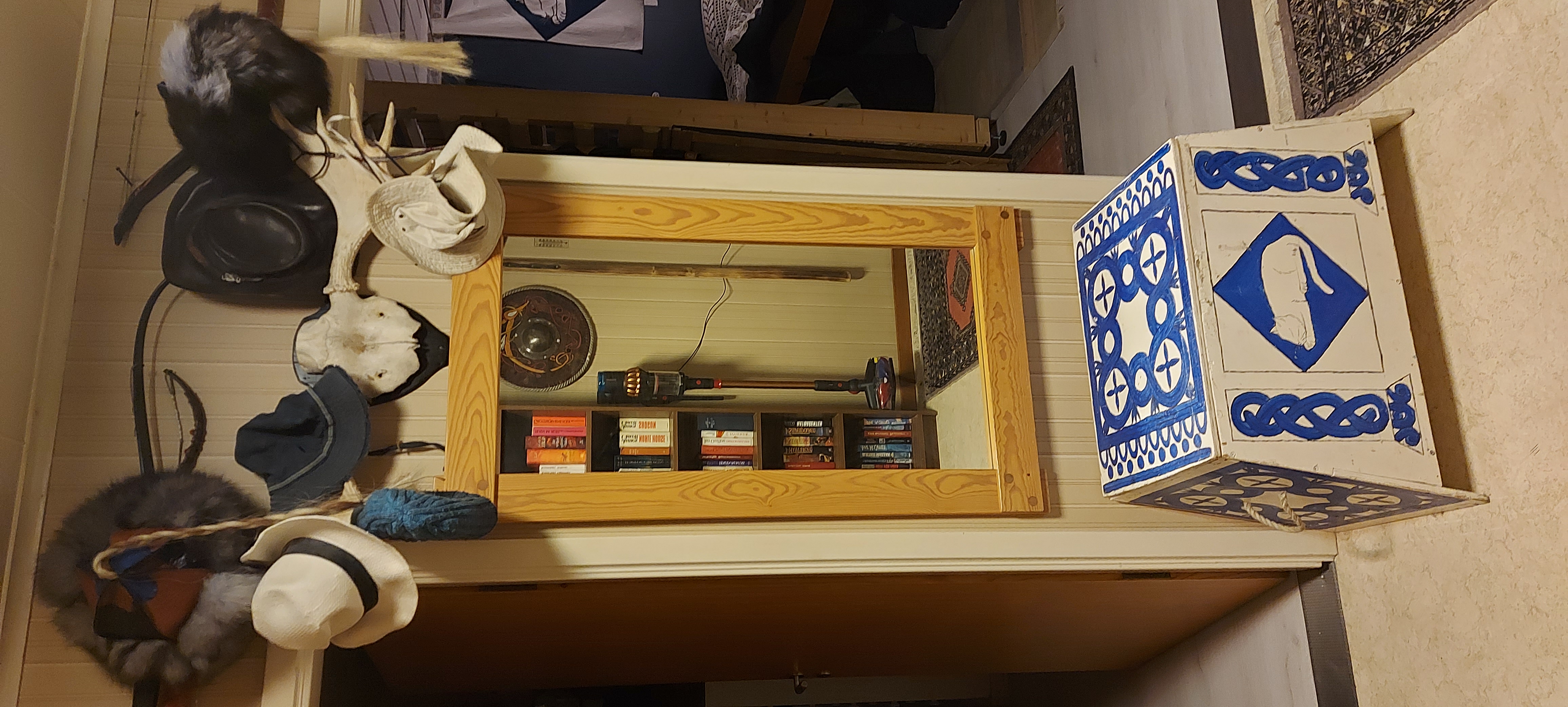 Then I slid the empty book shelf to the side, and moved the painted armour box to where it had sat, put the mirror on the wall between the doors above the box, the hat rack above that. It all looks much better stacked like that than it had spread out actosd the wider wall.