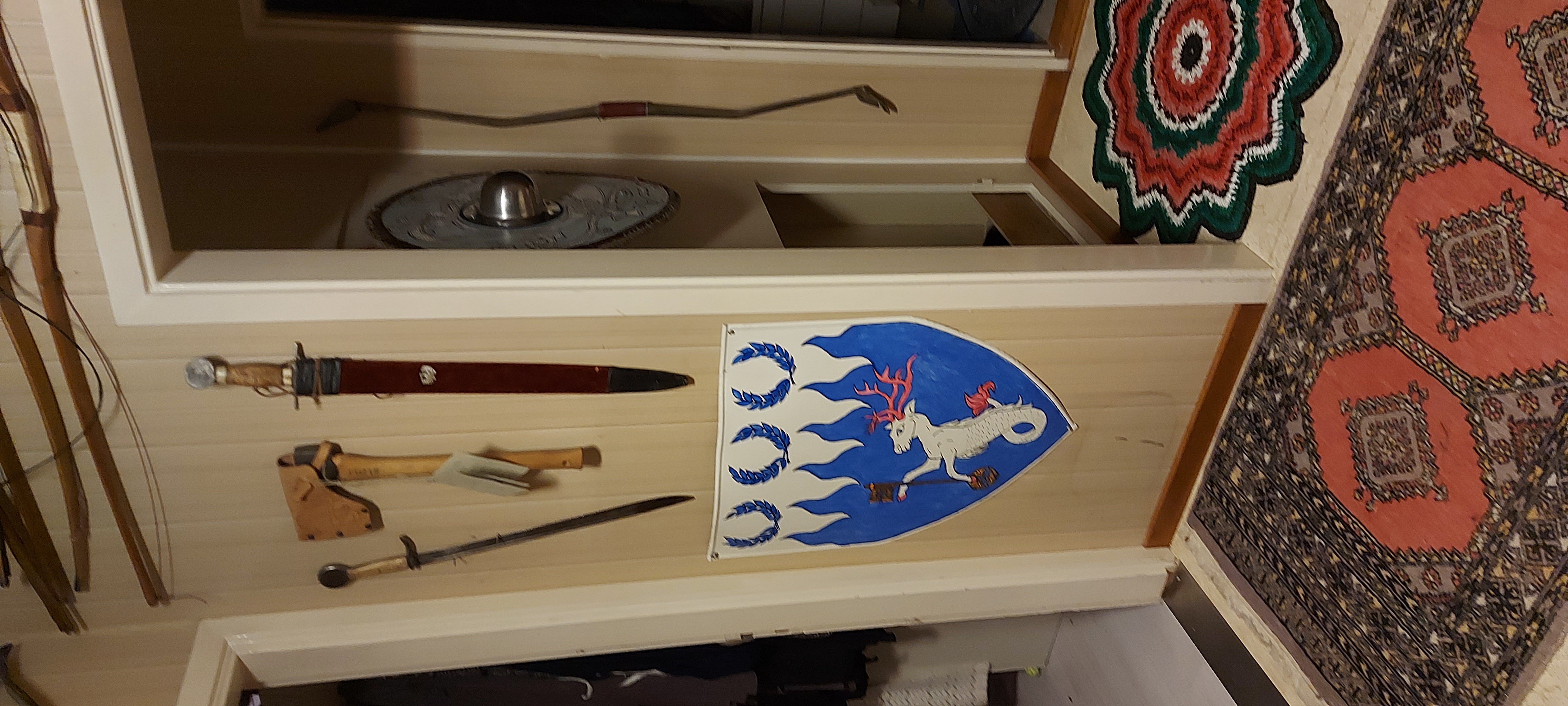 Then I hung the sword over on the wall between the bedroom and bathroom, next to the axe that was already there, and put the other shield below them.