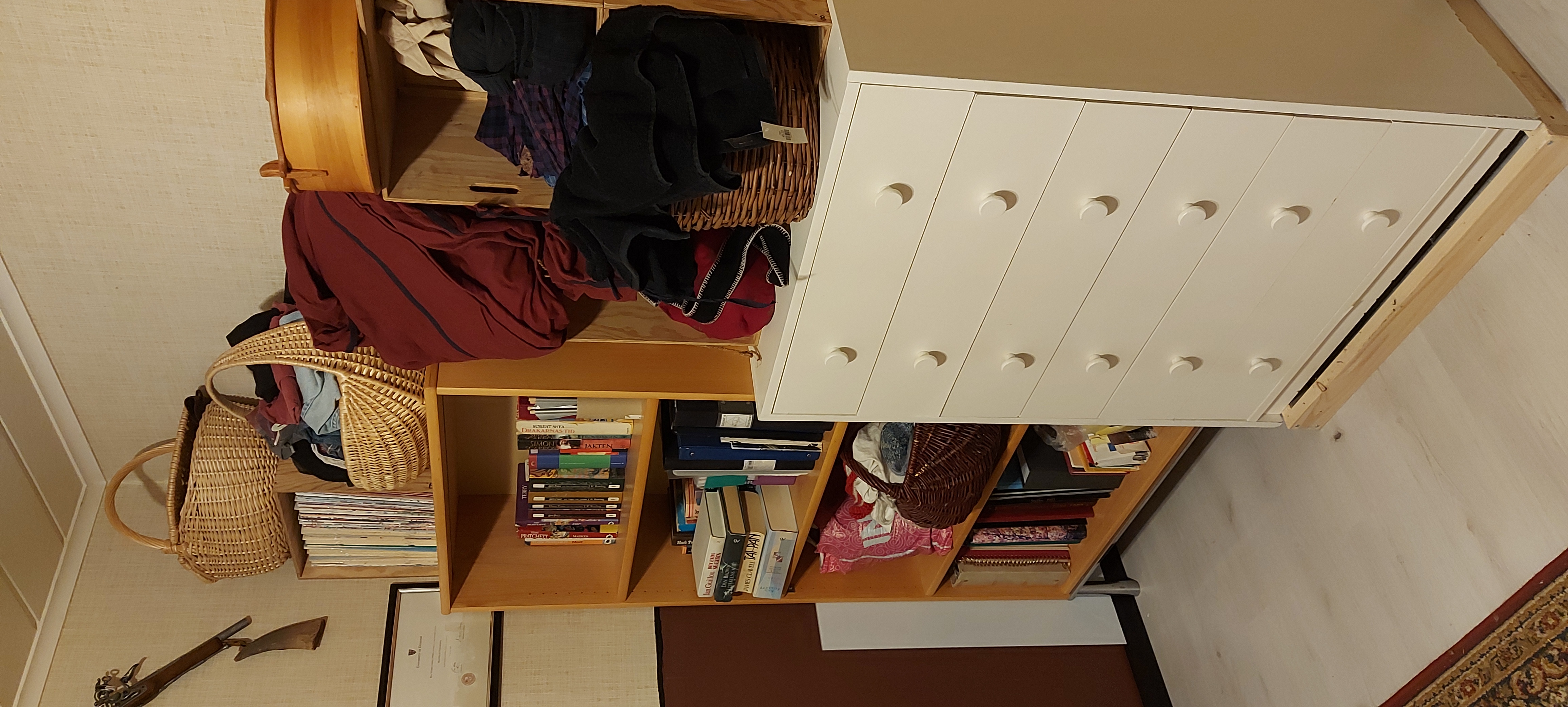 Once that bookhelf was full, I slid the chest of drawers that had been in the office corner beyond the wide bookshelf (but shallower than the narrow shelves) out enough to put the narrow book shelf between it and the corner. This solved the problem of easy access to those drawers.