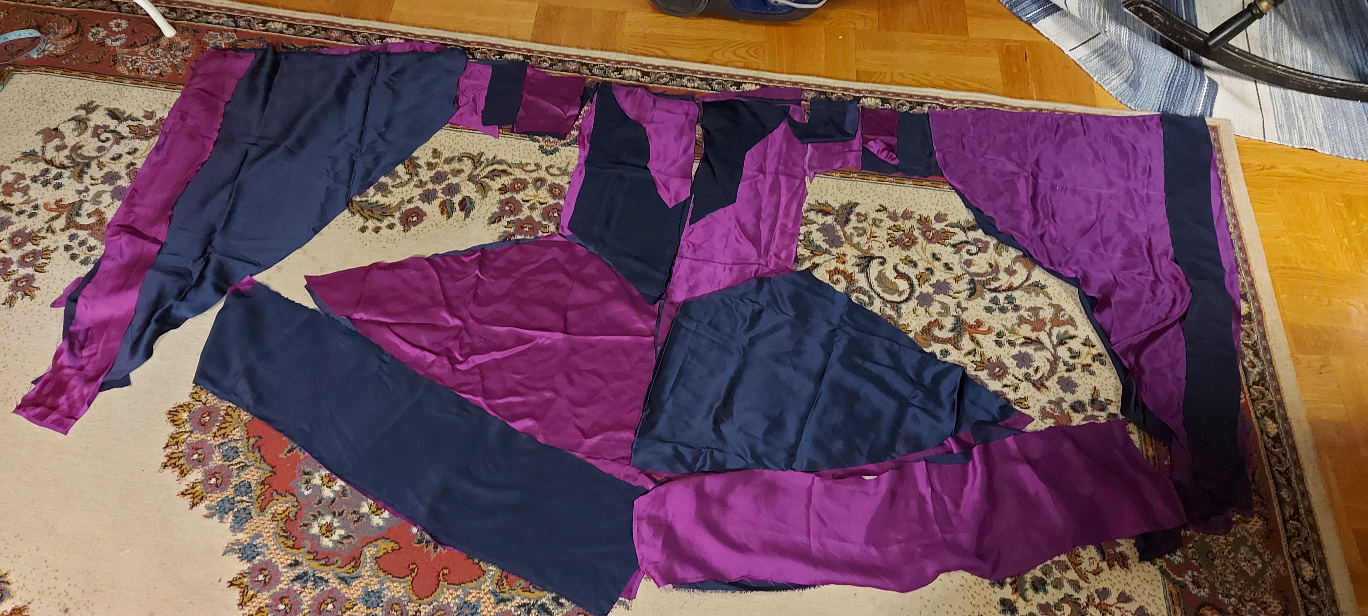 This evening I cut out a sewing project, Silk bliaut short tunic from the blue silk I bought at Cudgel, and some purple silk I had bought at an event longer go. I considered the purple I had bought at Cudgel, but it is quite a bit thicker than the blue, while the one i have had longer is a better match for texture.