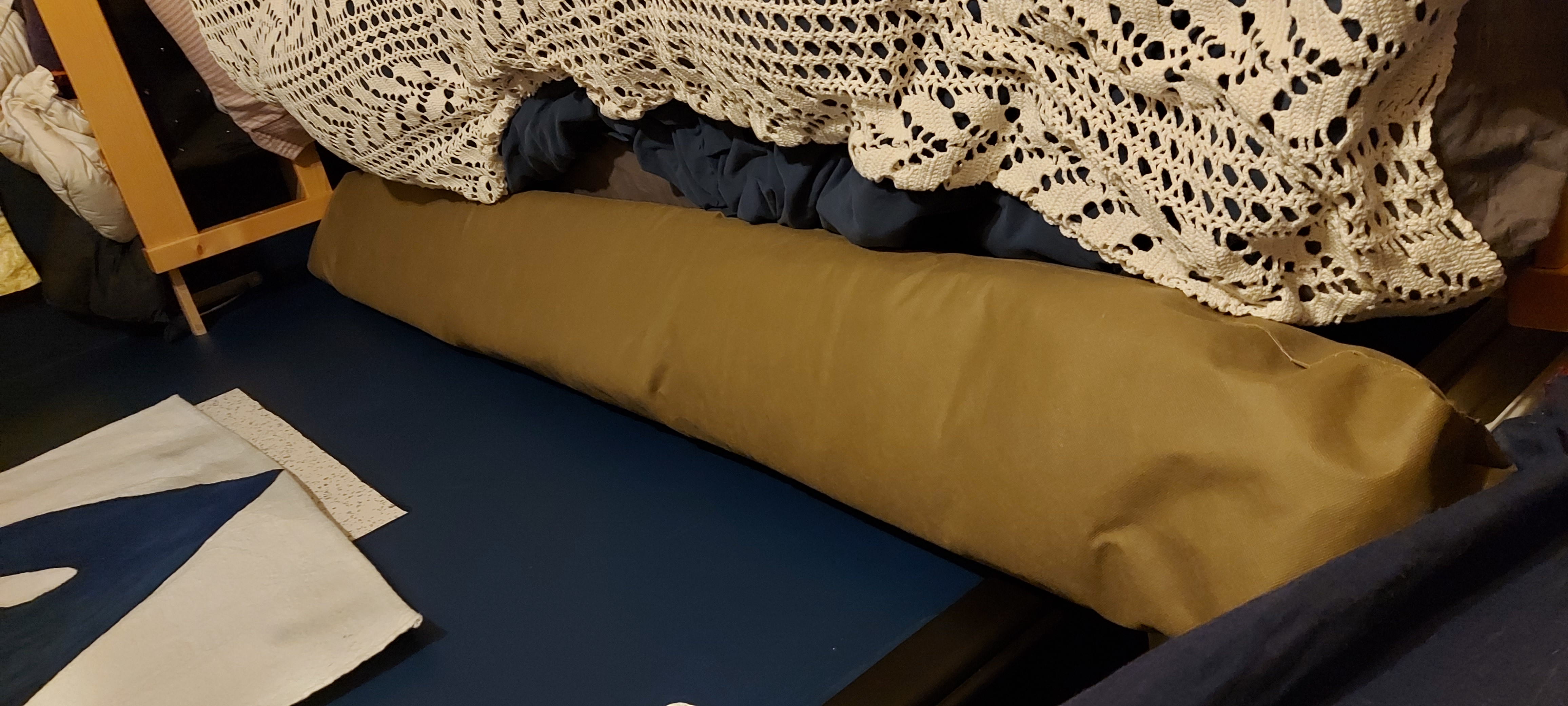 - Covered them with fabric from shipping bags of the new couch, tubes sewed a 64 cm wide rectangle into a 2 meter long tube, stuffed with couch cushion bits.