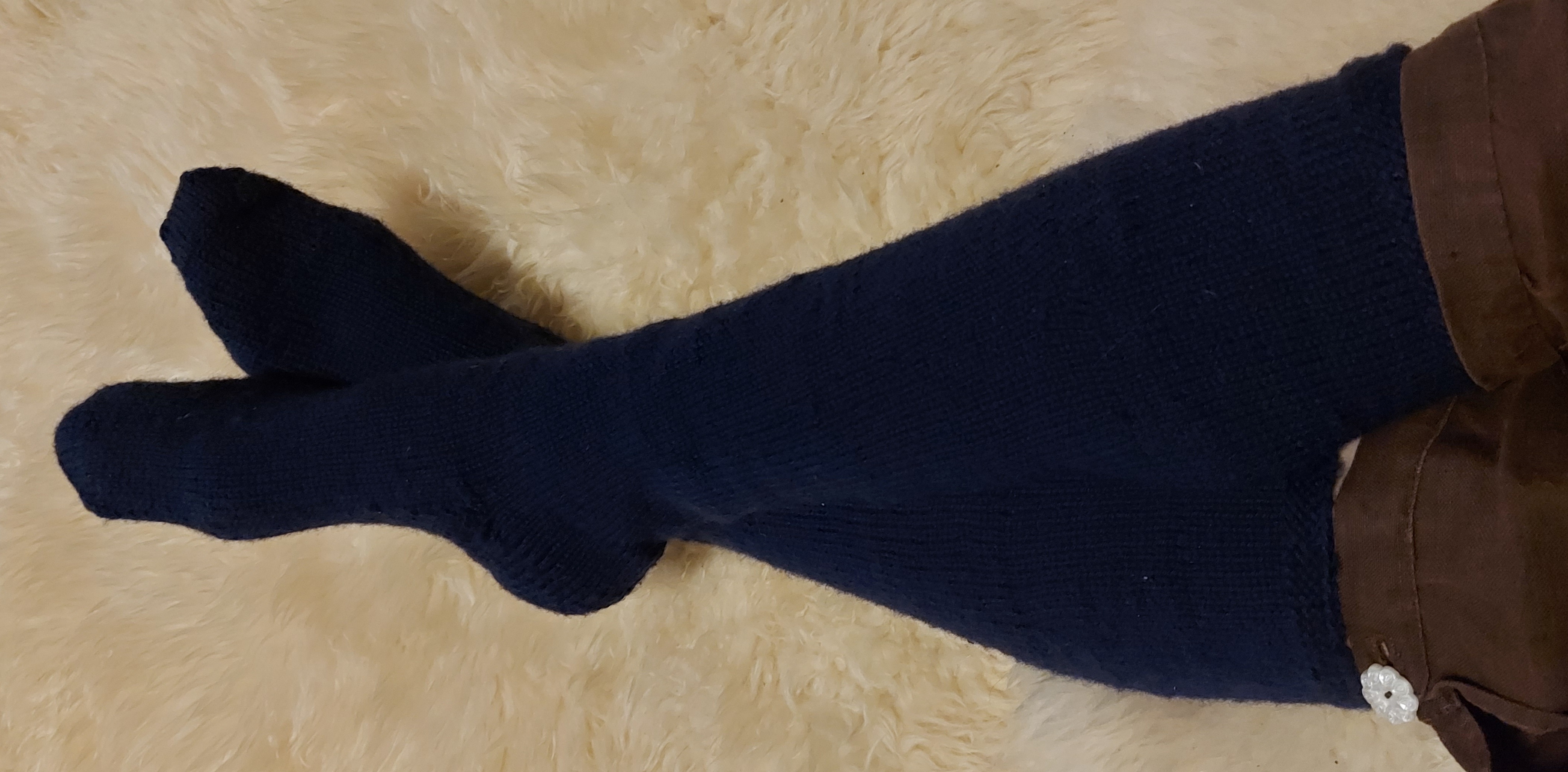 In addition to being SCA, Hjalmar is also a member of a Karoliner reenactment group (late 1600’s, early 1700’s, during Sweden’s “stormakt” time). Therefore, last year he taught himself knitting to make appropriate socks to wear with his knee breeches. Keldor saw that, and suggested he make me a pair, in dark blue, to go with my brown linen knee trousers.