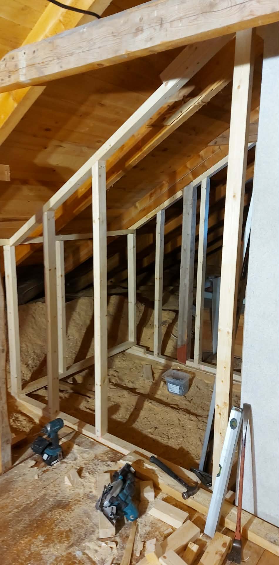 Simon came and did the first steps for our attic bathroom. The old floor is up, and the wall frames are on place.