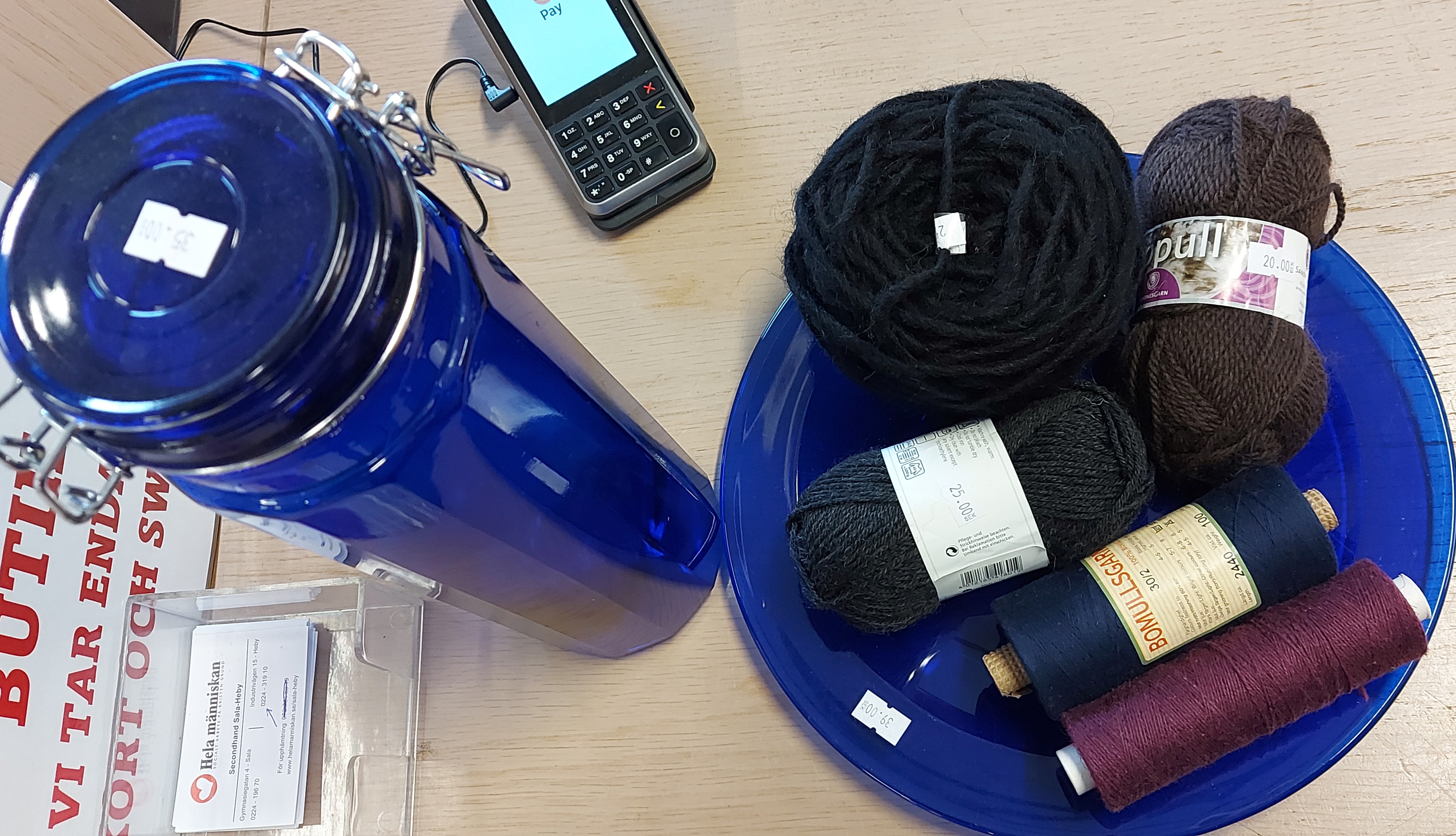 Second had store in Sala, I bought blue glass plate, tall jar, and yarn, 150 kr