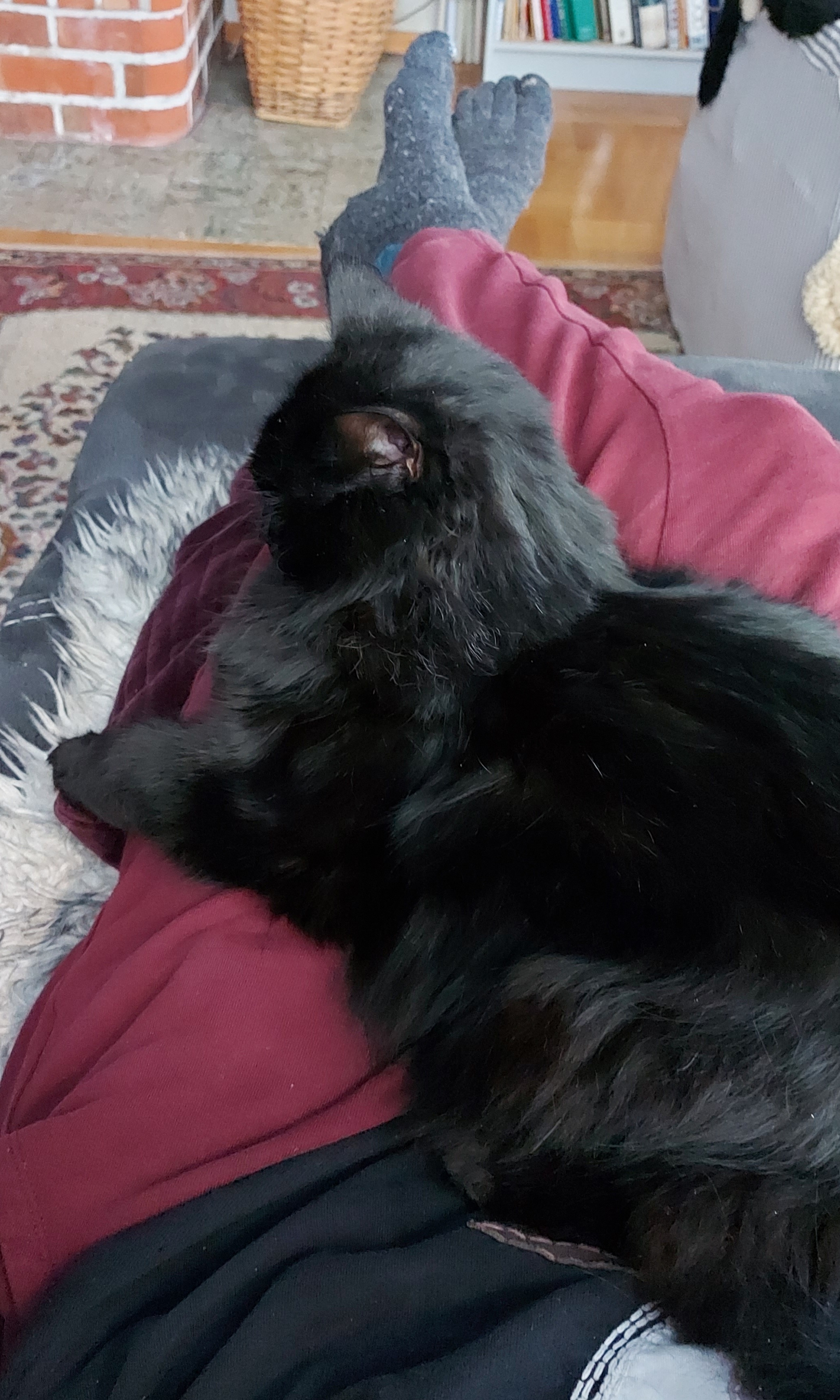 Then I took the bag of left over barley from the event, which turns out to also conain cheese. So I blended it with som canned tomato, lentils, etc. For a quick yummy stew, which I took to the couch to eat, and Skaði joined me, and I spent a couple of hours trapped under a cat, reading, updating logs, and chatting with people. It is a good life.
