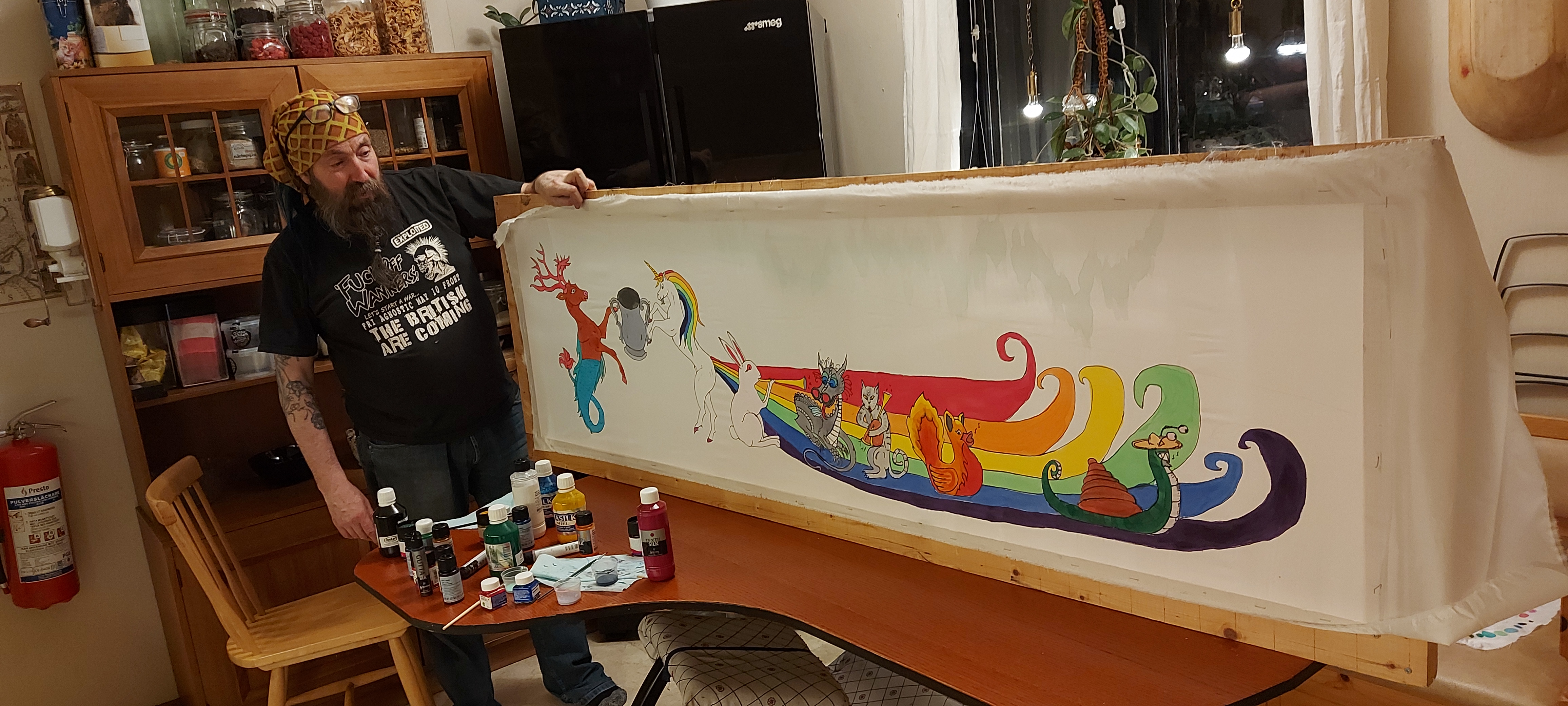 After work we cut the linoleum for the new bathroom floor, which we will put into place this weekend. Then we got a lot more painting done on the Camp Northern Lights Banner in progress: