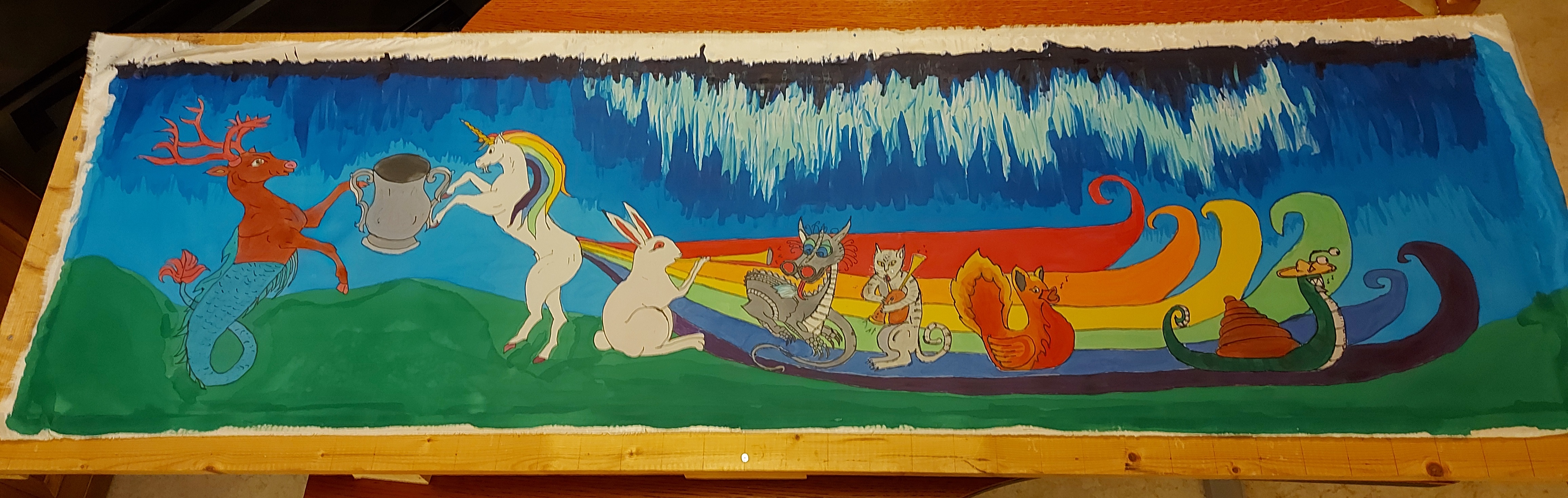 After Keldor got home we painted the rest of the sky and the ground for the Camp Northern Lights Mascot Banner.