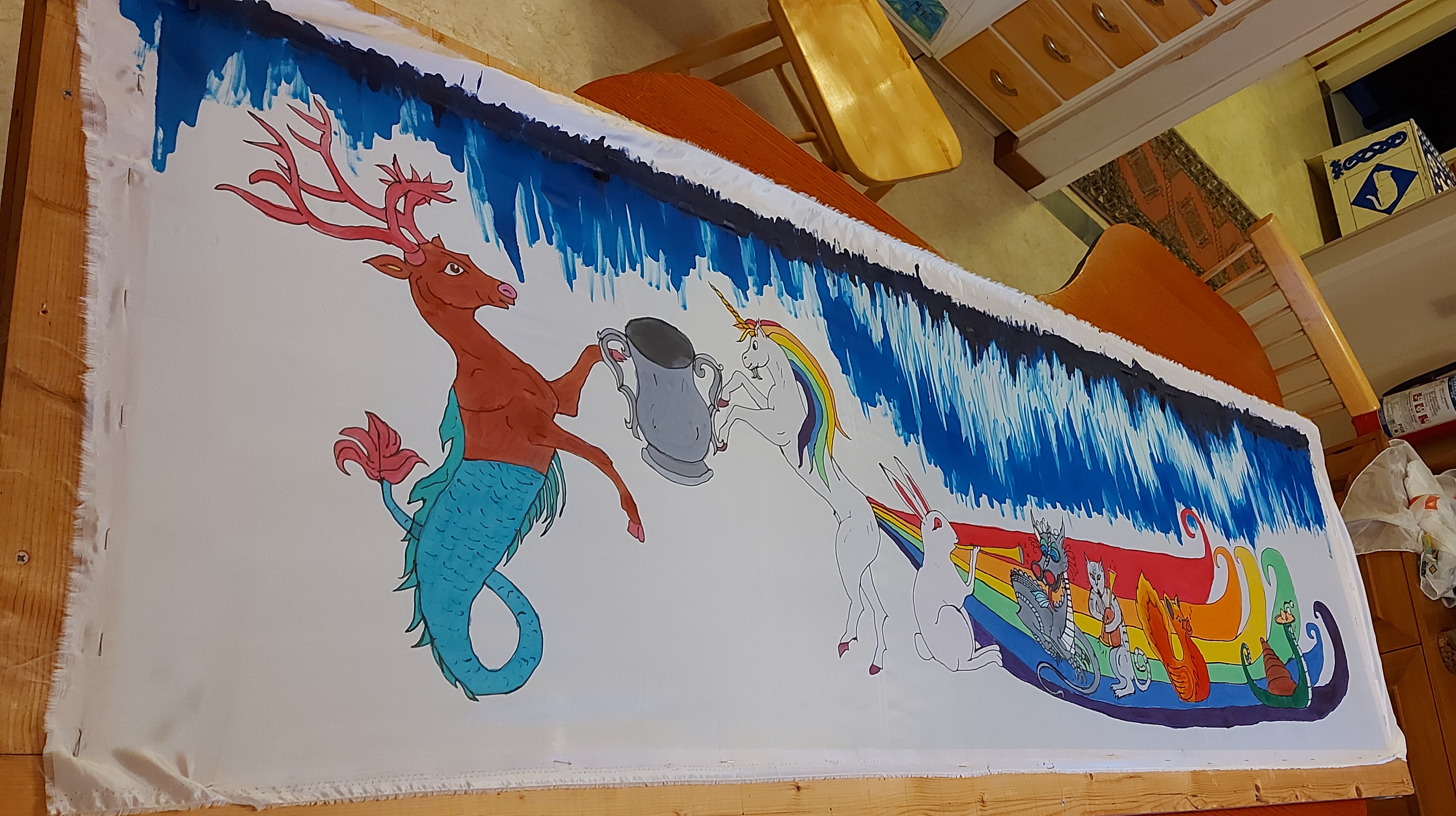 Got up with Keldor at 05:20 as usual, of course. During our morning phone call, I started painting the sky on the banner in progress.