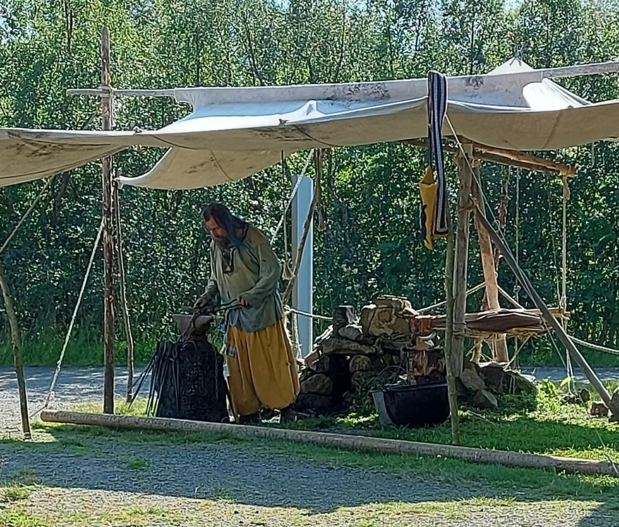 At the end of our couple of weeks out there, when we took it down for the end of the season we realised that having it out in the sunlight, plus all the smoke from the forge had worked magic, and while discoloured, it no longer smelled of mould. We couldn’t bring ourselves to throw away that much canvas, so we rescued it.