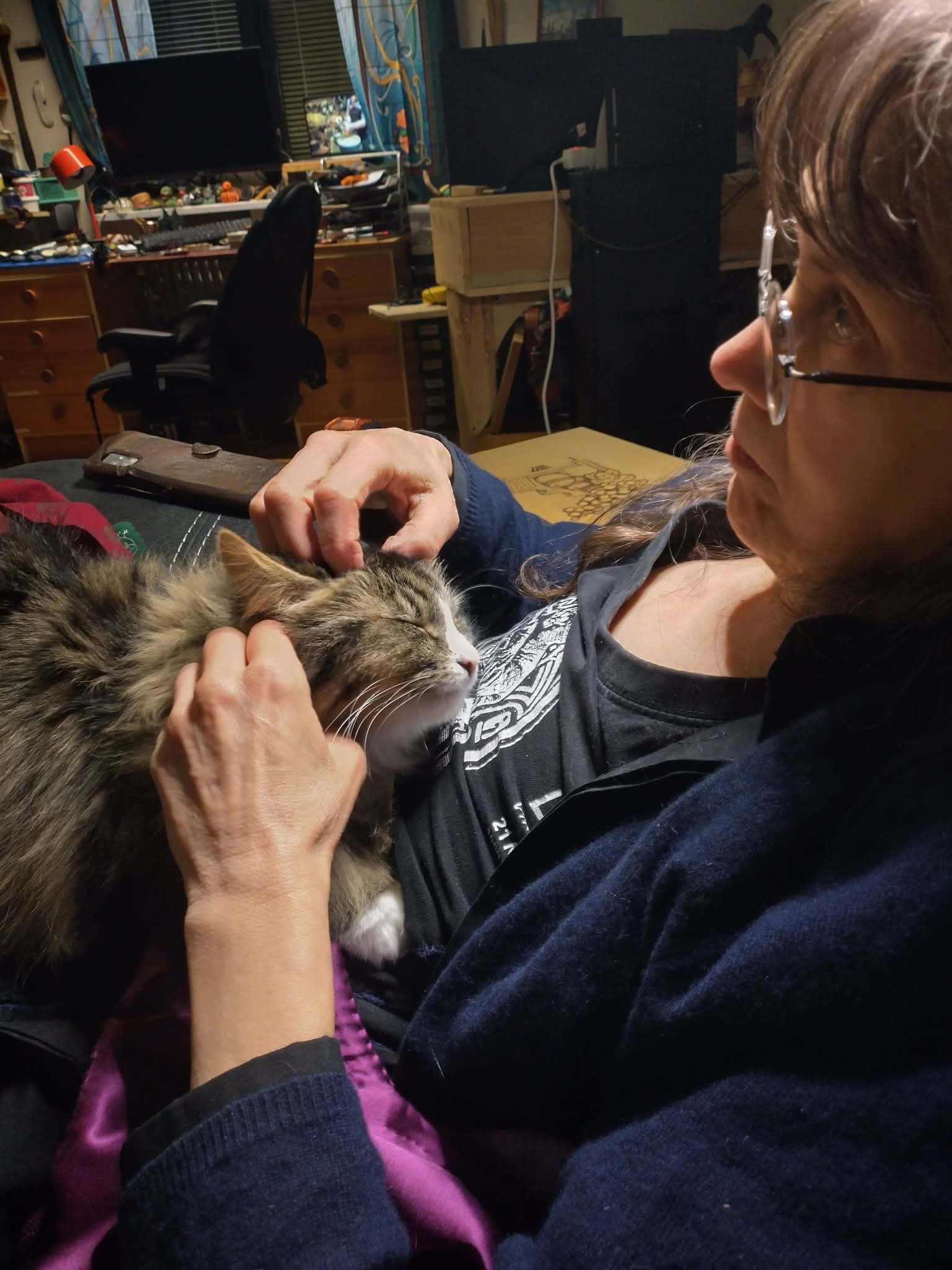 I expected to sleep in after yesterday’s road trip, but woke at 05:34, so I got up, fed the cats, did a 15 min pilates, took my morning vitamin, and decided that I was awake enough to work for a while, so I put in 4 hours, then took an hour nap, enjoyed lunch and a game of Qwirkle with Keldor, and then resumed work while he made a new knife handle.