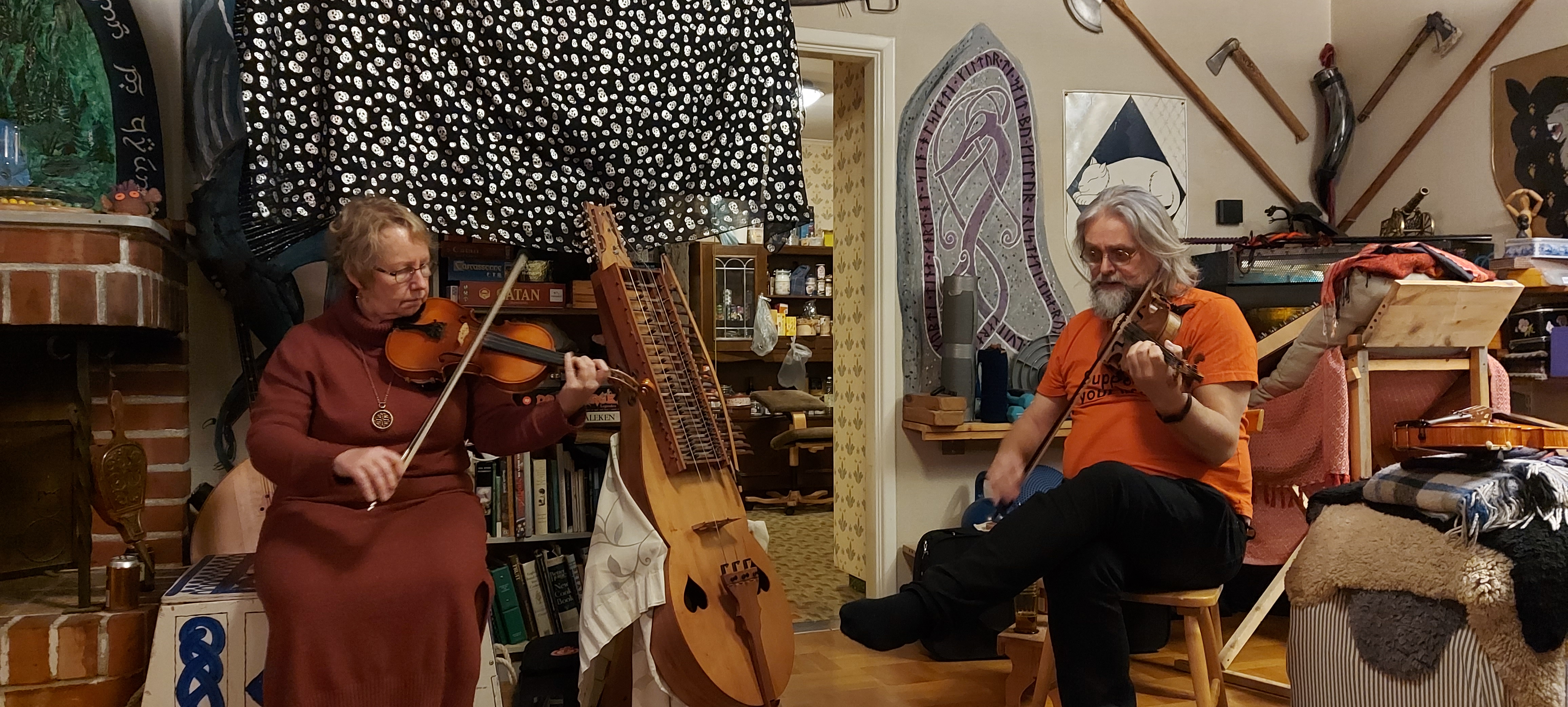 At this point Mickel Räf arrived, and when he learned I was tuning the moraharpa he offered to help, which assistance I cheerfully accepted. Then he tried playing it, and did a good enough job that I had no problem recognising the tune he played, though he commented that it would take time and practice to be able to play it smoothly Then Albreda tried it, and also got recognisable tunes straight away.