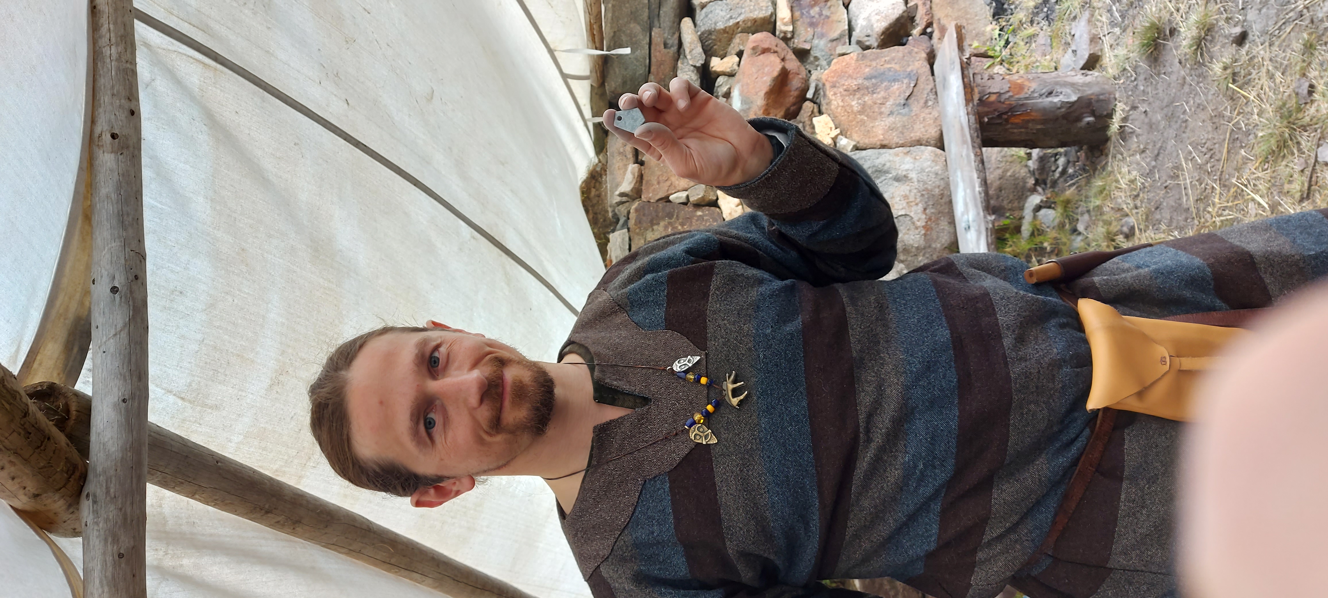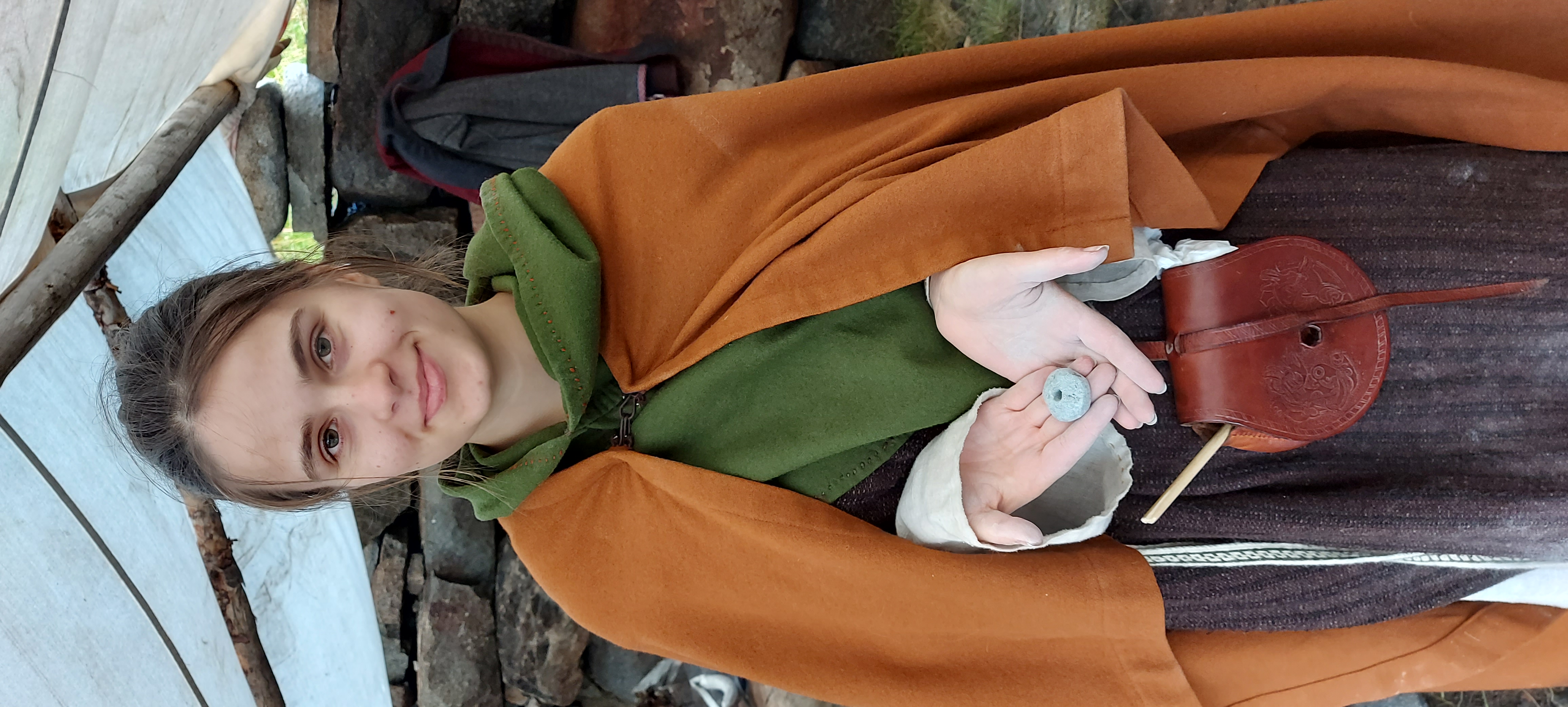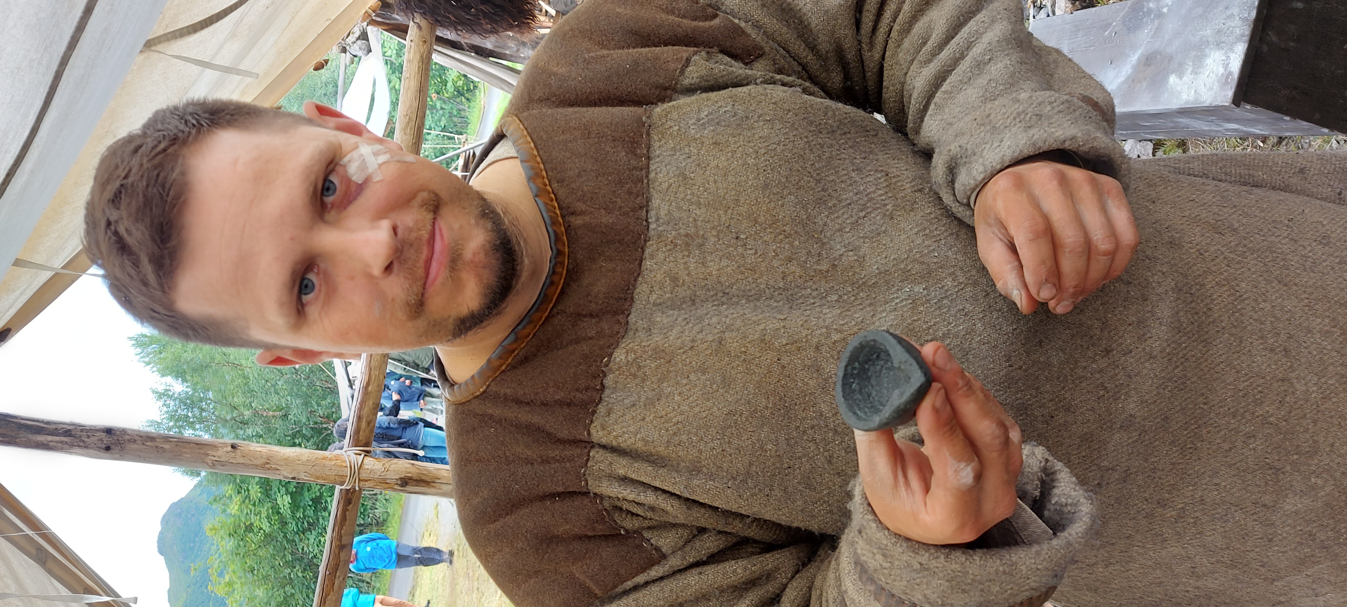 I took photos of most (but absoutly not everyone) of the people and their finished projects, and just counted. 21 people! Most of whom did small things like spindle whorls or necklaces, but there were a couple of oil lamps. Eight of these were festival participants in Viking clothing, six were children in modern cloths, and seven were adults in modern clothes. At least one more adult finished a piece,showed it to me and left before I thiught about asking if I could take photos, and I am pretty certain a handful of other children participated without showing me a finished product.