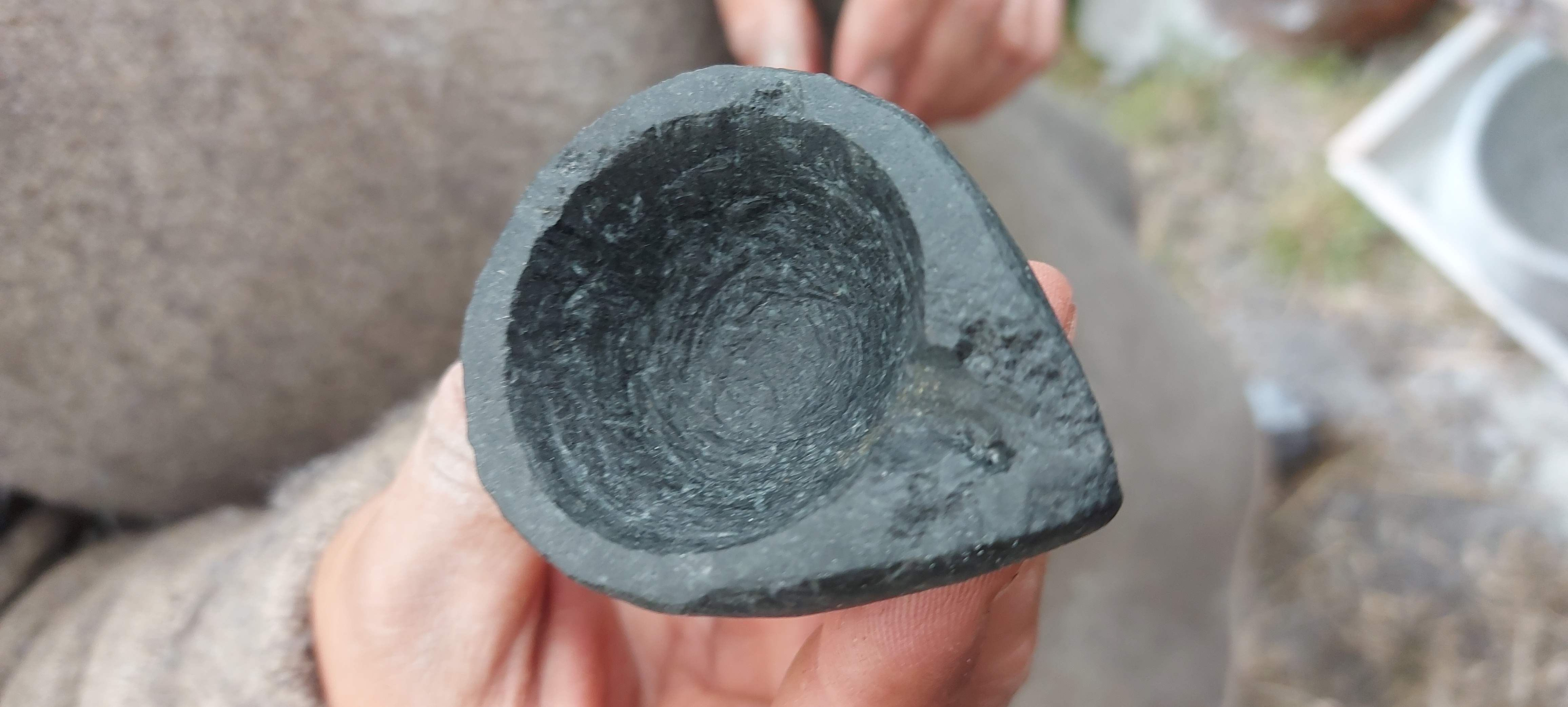 Drift did deliver the box of large soapstone pieces and the large soapstone bowl full of small soapstone pieces on time, and Ole-Andreas found me the bowl full of knives and the laminated printouts Elisabeth had made from the pdf of small soapstone artefact photos I had prepared.