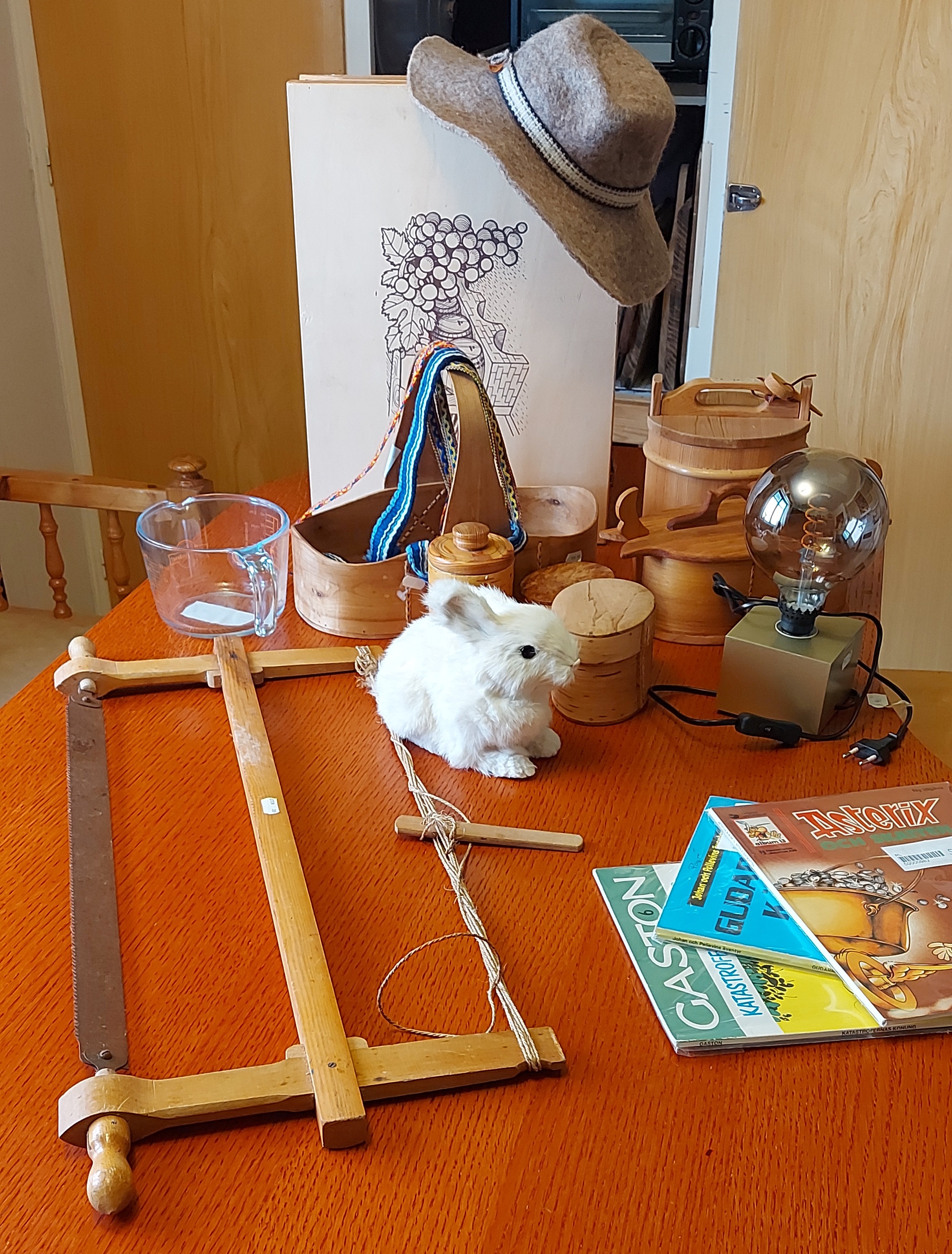 While waiting he came home and picked up the old freezer we are getting rid of, now that we have the better one from his dad. Since he wasn’t working, I failed on my attempt to work on the bus, and we hung out chatting till my bus got to Ånäset, where I hopped off and met him, and we went to the Stenfors Antique and second hand store, where we bought lots of things. Hand woven bands, bentwood boxes, wooden bucket style lunchbox with lid, a medieval style saw, a felt sun hat, a mad scientist lightbulb lamp, some Asterix comic books, a bunny, and a large wooden box suitable for carrying large scrolls.
