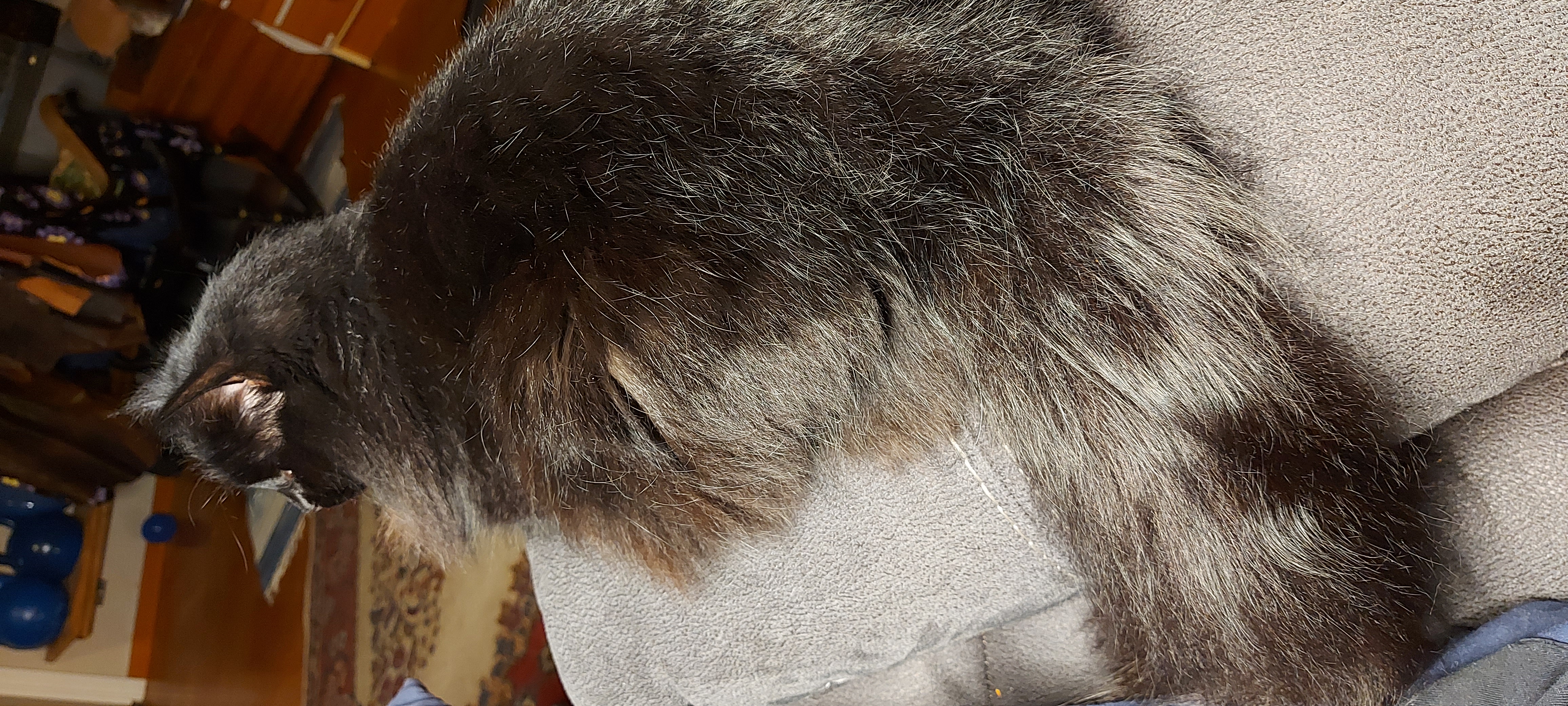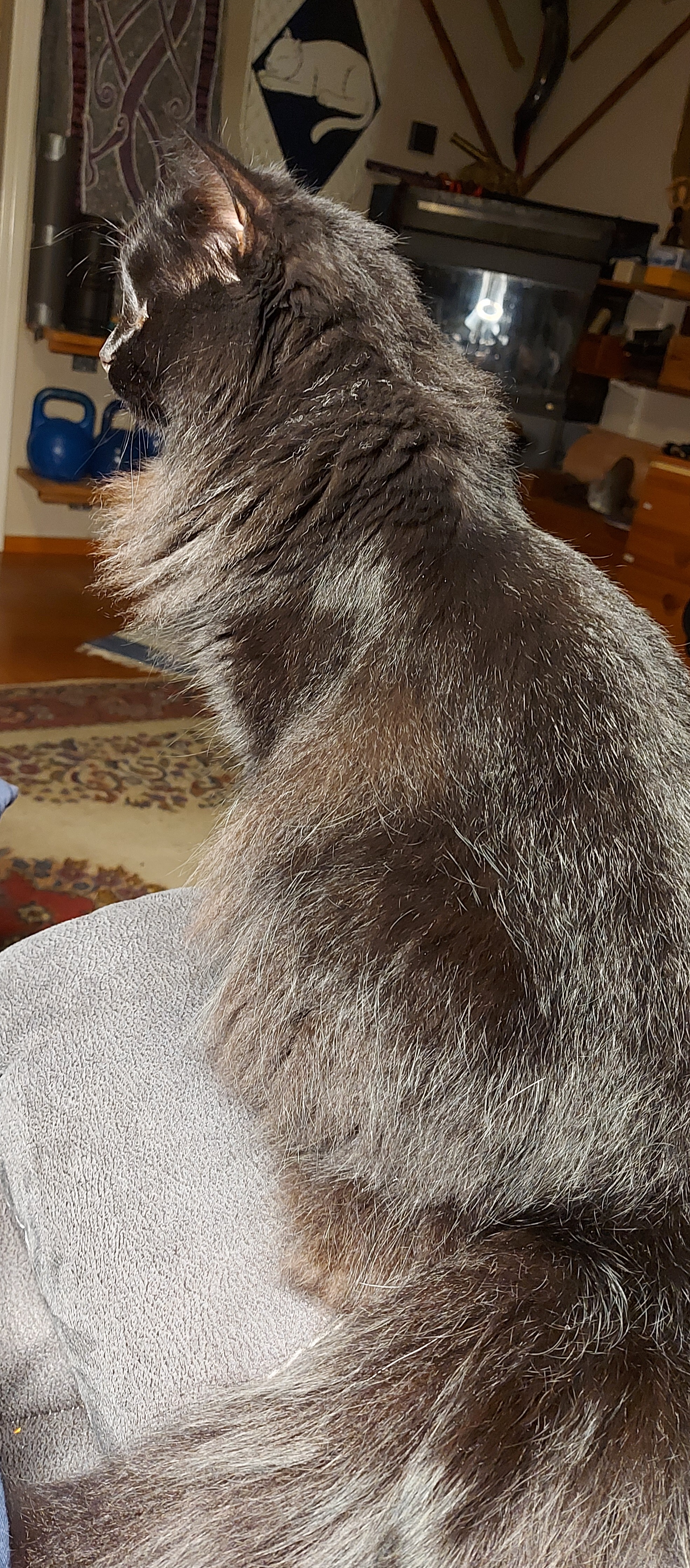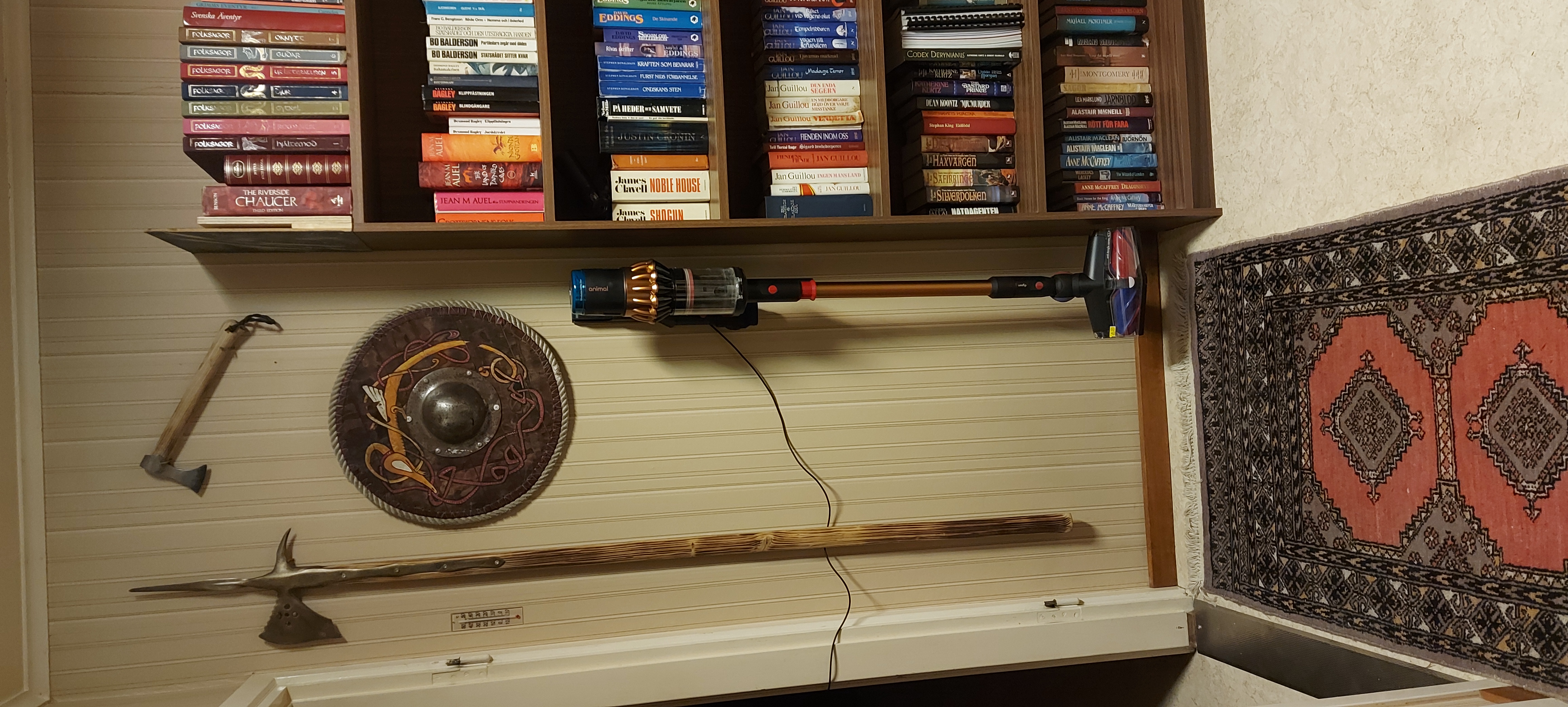 I sat down on the couch to do a little carving on the Skellefteåyxa mould while talking with Keldor durring his drive to work, and couldn’t find a good focal distance through the magnifying lamp. Then I remembered that it works better with my computer glasses than my normal (progressive) lenses, and pushed the lamp up out of the way, so I could go get them and realised that Skaði had come to sit on the arm of the couch next to me. In such bright light the brown of her undercoat really shows! Since I worked from home, I managed to wash the bedsheets, so sleeping tonight will be wonderful. The vacuum cleaner I ordered arrived today. A Dyson V16 Piston Animal, which comes with a way to wall-mount it. Problem: no walls with enough space! I did several laps around the house, holding the vaccum, looking for a suitable location. It needed to be convenient to grab the vacuum when needed, but not in the way, with electricity near enough so that the battery will be charged. Several more laps around the house later, I was hit with an inspiration that not only solved the where to put the vacuum problem, but also several other problems that have been bothering me at a low-level backgroundsort of way. Implementing the plan took several hours: