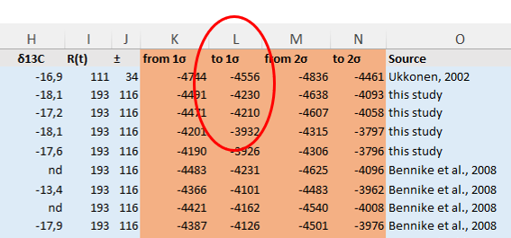 Values in the ‘to 1σ’ column represent the upper bound of the calibrated age at one–standard-deviation (68%) calculated from the uncalibrated radiocarbon age range reported by the laboratory (column F. BP).
