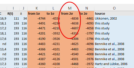 Values in the ‘from 2σ’ column represent the lower bound of the two–standard-deviation (95%) values calculated from the uncalibrated radiocarbon age range reported by the laboratory (column F.).