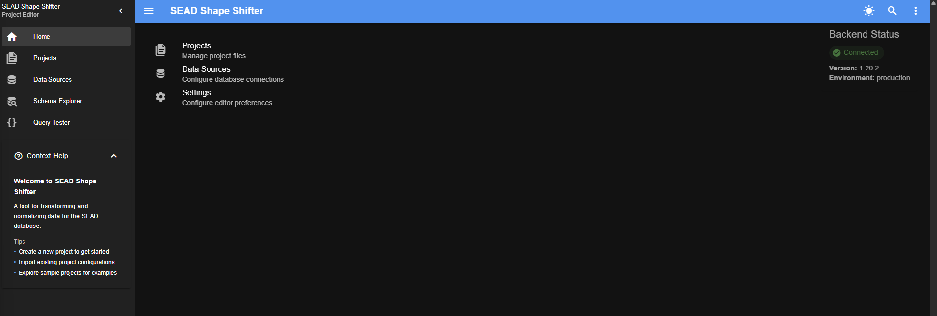 - Projects Choose this option to open an existing project, or start a new project from a data source that is already present in SEAD Shape Shifter