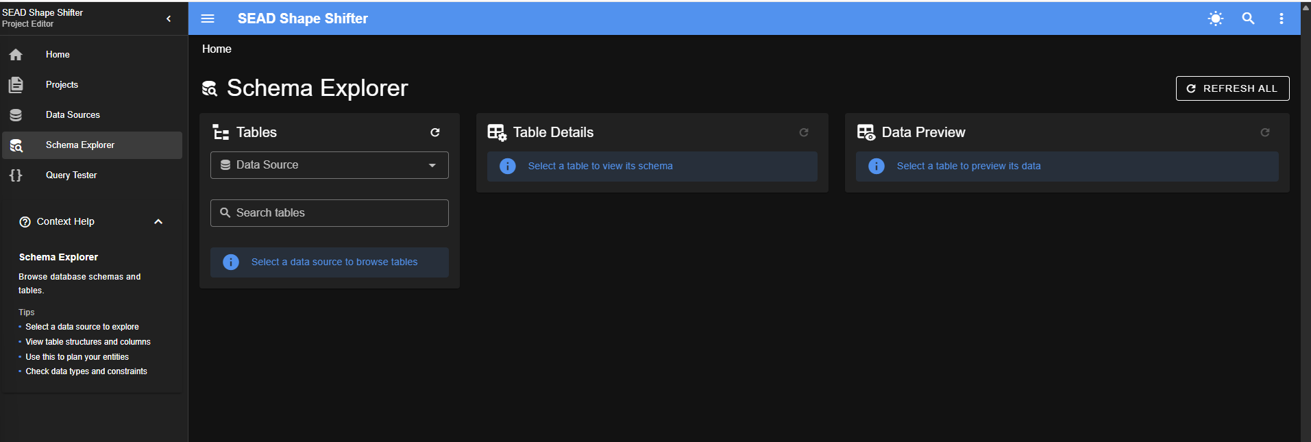 In this window you select aData Source from the drop down menu to open the list of tables in that data set. After selecting a data source you select a table within that source by clicking on it (or use the Search Tables box). Then press either “REFRESH ALL” on the upper right side of the screen, to open information from that table in the other two sections. (Alternatively, press just the refresh button within a section to open the information only for that section of the screen)