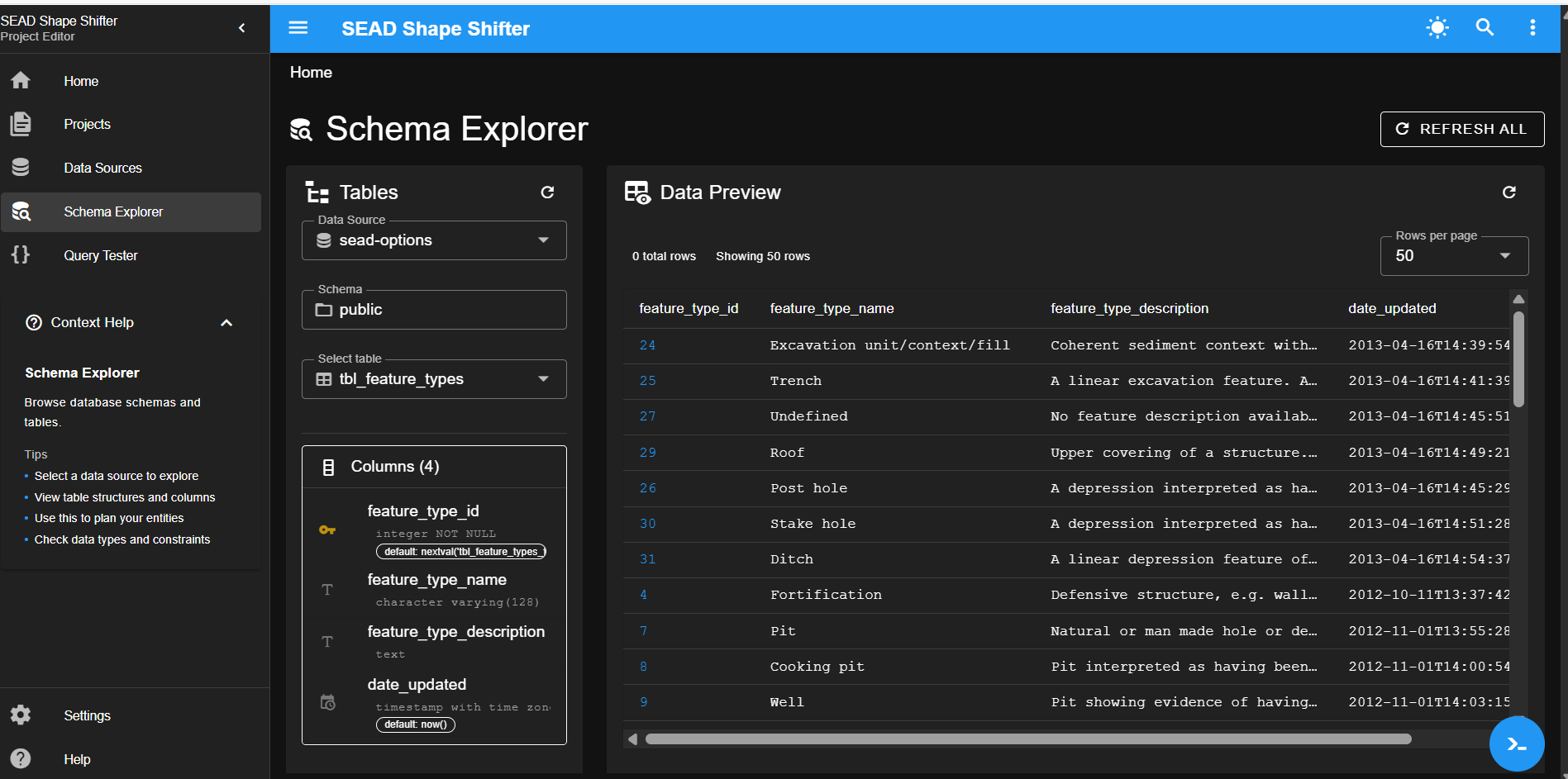 In this window you select a Data Source from the drop down menu to open the list of tables in that data set. After selecting a data source you select a table within that source by clicking on it (or use the Search Tables box). Then press either “REFRESH ALL” on the upper right side of the screen, to open information from that table in the other two sections. (Alternatively, press just the refresh button within a section to open the information only for that section of the screen)